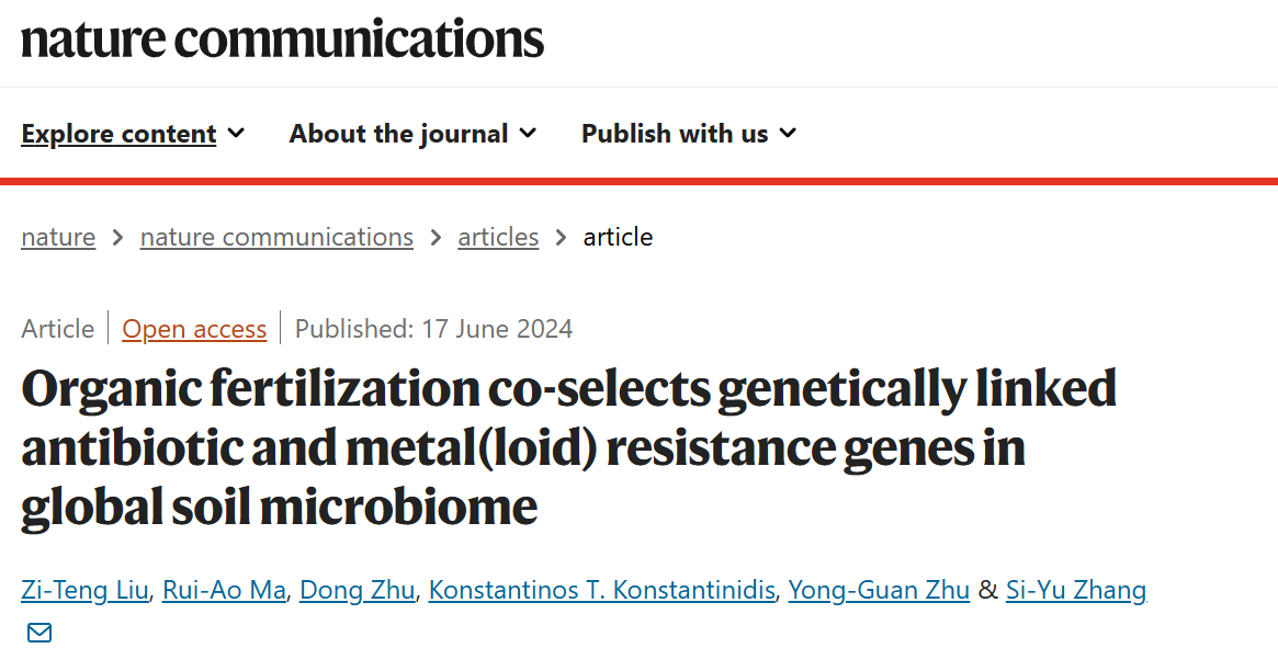 相关成果以Organic fertilization co-selects genetically linked antibiotic and metal(loid) resistance genes in global soil microbiome为题在Nature Communications在线发表。张思宇研究员为通讯作者,博士研究生刘子腾为论文第一作者。