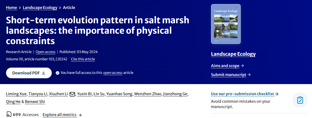 河口海岸学国家重点实验室李秀珍研究员团队在盐沼湿地植被格局与关键生态过程相互作用方面取得新进展,揭示了水-沙-地貌共同作用下盐沼先锋植被演变格局在景观水平的空间分异,阐明了物理条件塑造盐沼景观动态多样性的关键机制。相关成果以Short-term evolution pattern in salt marsh landscapes: the importance of physical constraints为题发表于Landscape Ecology。
