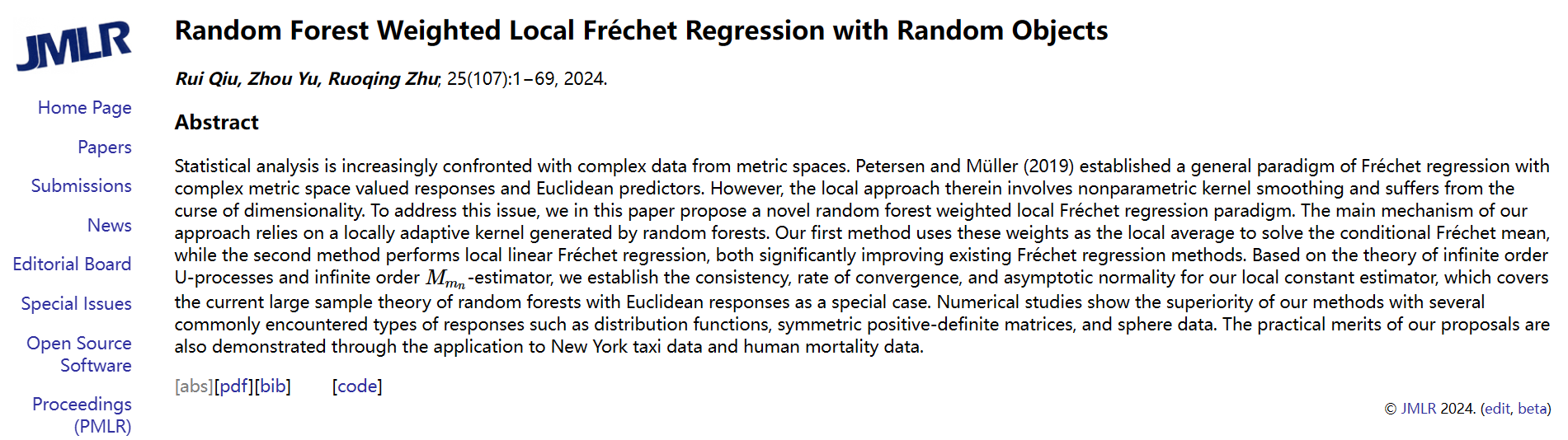 其研究成果Random Forest Weighted Local Fréchet Regression with Random Objects在线发表于机器学习期刊Journal of Machine Learning Research。