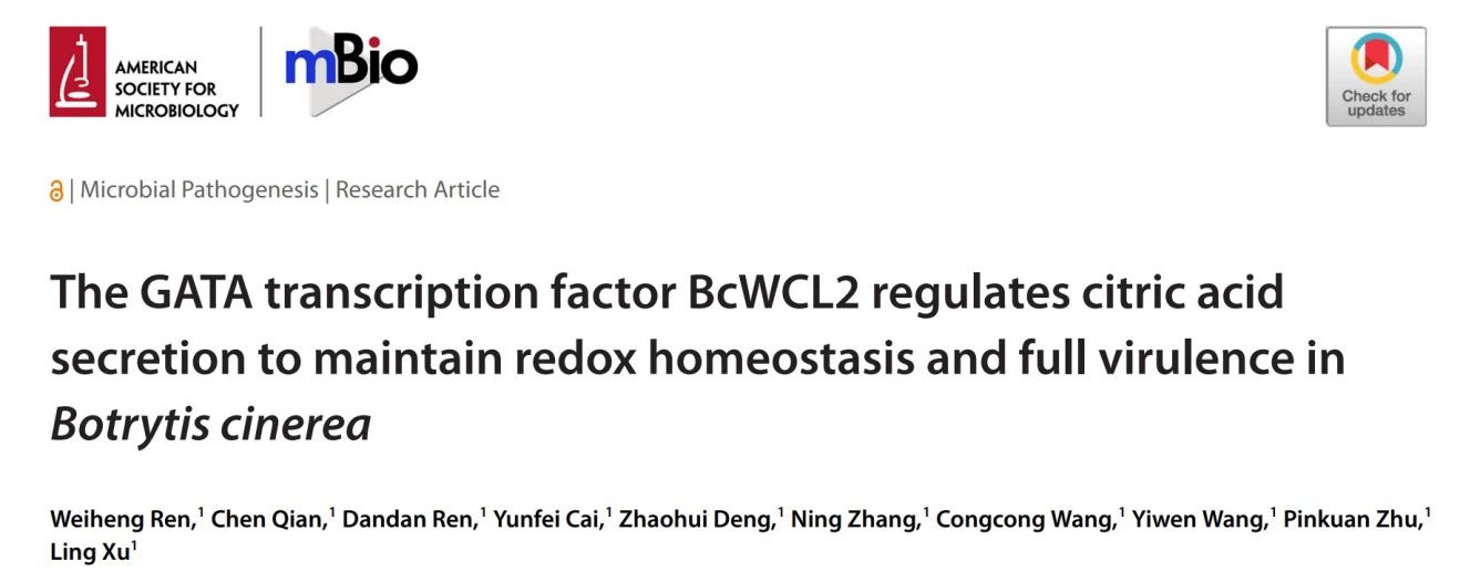5月30日,生命科学学院分子植物病理与果实品质安全课题组在微生物领域期刊mBio上发表题为The GATA transcription factor BcWCL2 regulates citric acid secretion to maintain redox homeostasis and full virulence in Botrytis cinerea的研究论文,揭示了灰霉菌通过调控柠檬酸分泌维持氧化还原稳态和致病力。