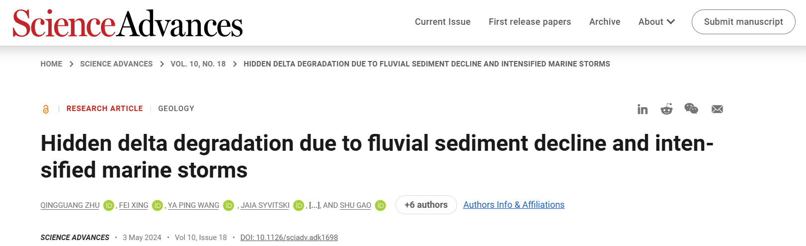 Science Advances发表最新研究成果:流域输沙量减少和海洋风暴加强导致的全球水下三角洲隐性退化