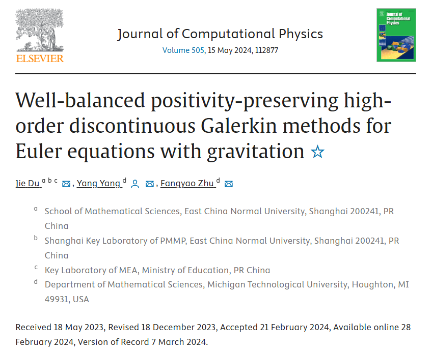 相关成果于5月15日以Well-balanced positivity-preserving high-order discontinuous Galerkin methods for Euler equations with gravitation为题发表于Journal of Computational Physics。数学科学学院青年研究员杜洁为第一作者。