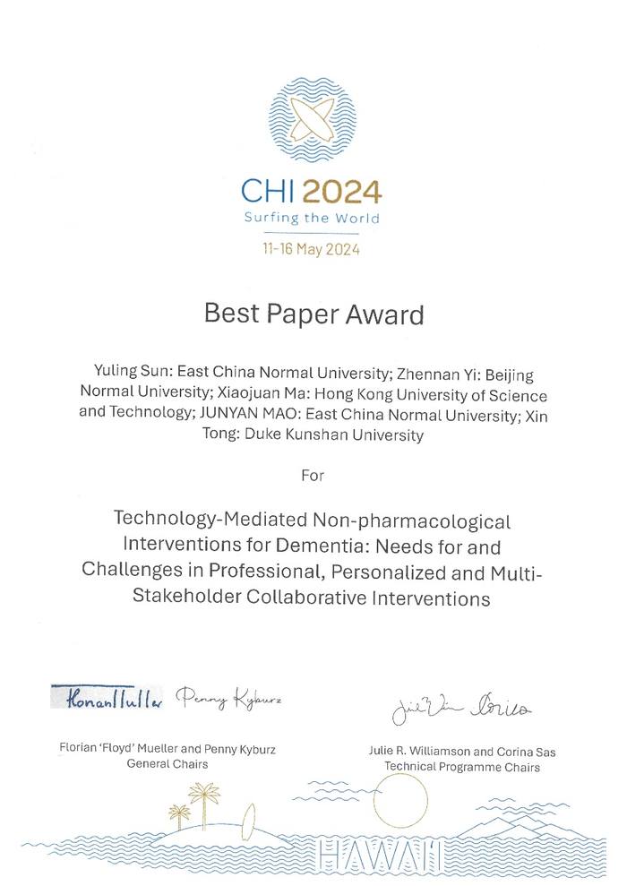 5月11日-16日,人机交互领域国际顶级学术会议ACM CHI 2024(CCF-A)在美国夏威夷召开。计算机科学与技术学院人机交互课题组孙玉灵博士以第一作者发表了题为Technology-Mediated Non-pharmacological Interventions for Dementia: Needs for and Challenges in Professional, Personalized and Multi-Stakeholder Collaborative Interventions的长文,并荣获“最佳论文奖(Best Paper Award)”。