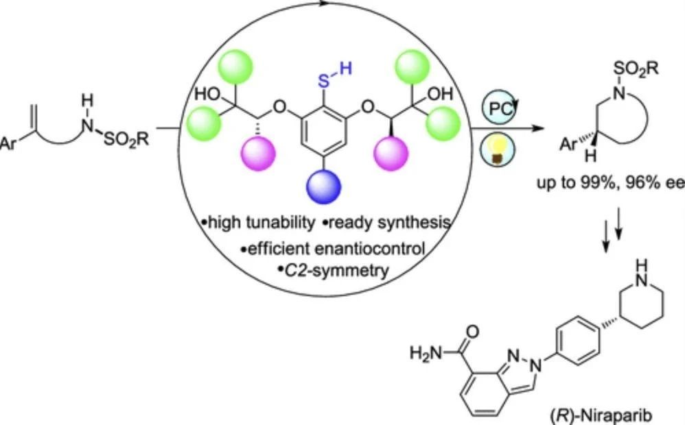 手性分子的对映体往往表现出截然不同的生物活性,不对称催化是合成手性分子单一对映体的高效方法。氢原子转移虽已存在于生物体内,但在生物体外由于催化剂的手性空间与自由基转移位点相距较远,使手性控制变得困难。近日,化学与分子工程学院董开武教授团队发展了一类手性硫酚氢供体催化剂,高对映选择性地实现了不对称氢胺化环化,合成一系列结构丰富的手性哌啶类分子,实现了抗癌药物尼拉帕利的形式合成。