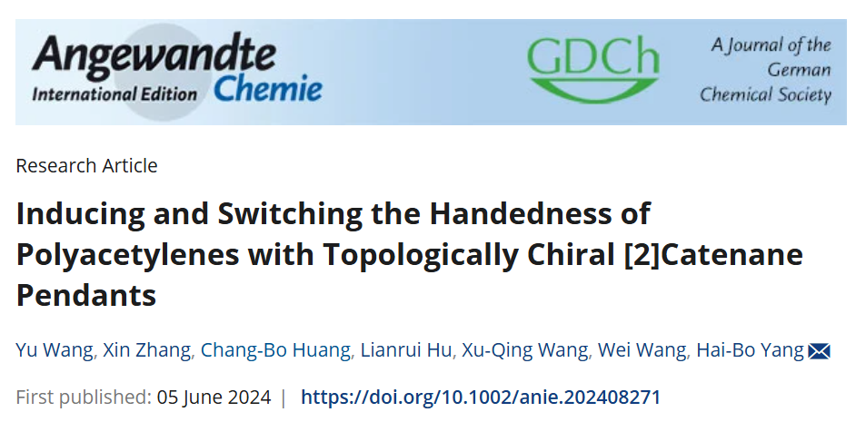 拓扑手性是指物体无法通过三维空间的持续形变转换成为其镜像的特性,其不具有传统意义上的手性中心,且具有较高的构型稳定性和多个构象异构体。化学与分子工程学院杨海波教授和王威研究员团队成功构筑了首例以聚苯乙炔为主链的聚拓扑手性[2]索烃,并应用拓扑手性[2]索烃侧基的多重共构象精准调控,实现了主链螺旋的多态手性开关响应。相关研究成果以Inducing and Switching the Handedness of Polyacetylenes with Topologically Chiral [2]Catenane Pendants为题,发表在Angewandte Chemie International Edition杂志。