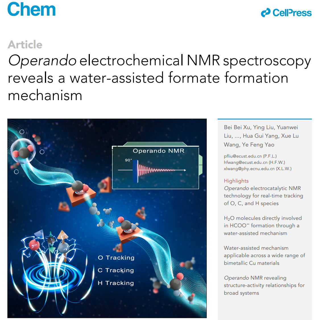 上海市磁共振重点实验室姚叶锋研究员、王雪璐教授团队成功开发原位电化学磁共振技术,通过碳纤维丝电极、质子膜封装、磁屏蔽导线与毛细线管路通气等核心技术成功设计了新型三电极原位电催化微反应池,解决了通电且固液气共存带来的磁场扰动难题,实现了产物不分离的情况下对CO2电还原过程中重要机理问题研究及产物动态属性解析。相关研究成果于6月26日以Operando electrochemical NMR spectroscopy reveals a water-assisted formate formation mechanism为题,发表在Chem杂志。