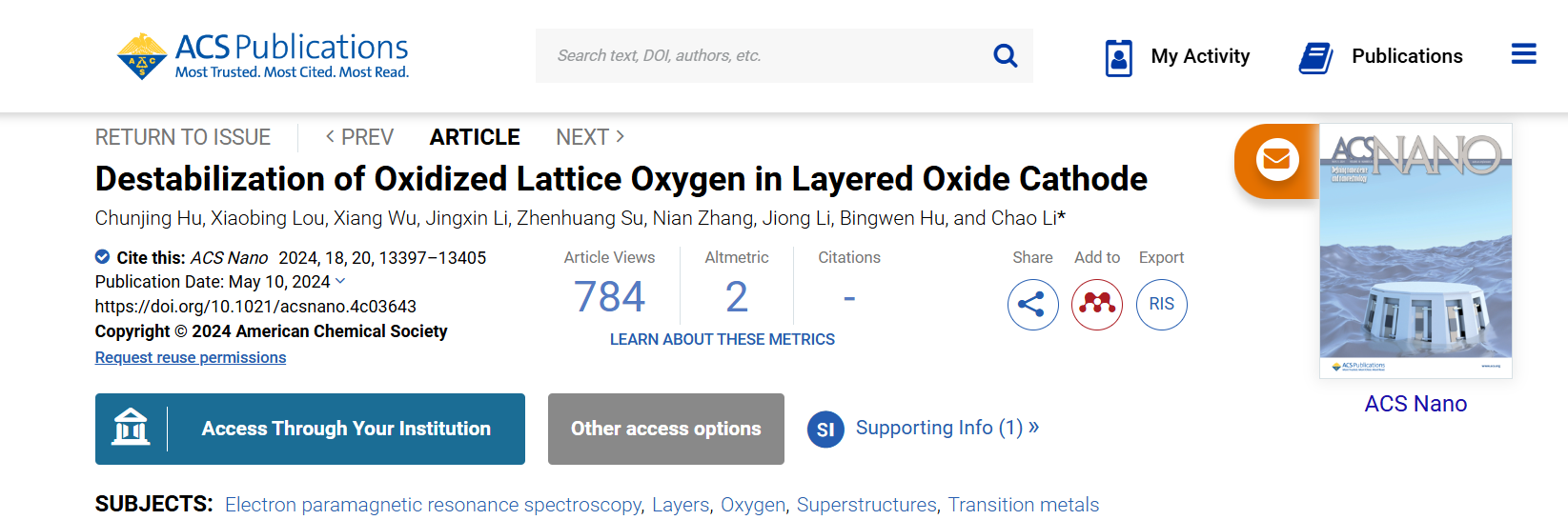 物理与电子科学学院李超青年研究员通过原位电子顺磁共振、固态核磁共振等表征,发现P3-Na0.6Li0.2Mn0.8O2在高压弛豫过程π-相互作用的氧会逐渐转化为σ-相互作用的氧,同时伴随着O-O二聚和局部结构重组。这种以氧为中心的键重组与充电态中Li+从碱金属层向过渡金属层的自发迁移紧密相关,并造成了超结构有序的部分重建。该成果以Destabilization of Oxidized Lattice Oxygen in Layered Oxide Cathode为题发表在ACS Nano上。