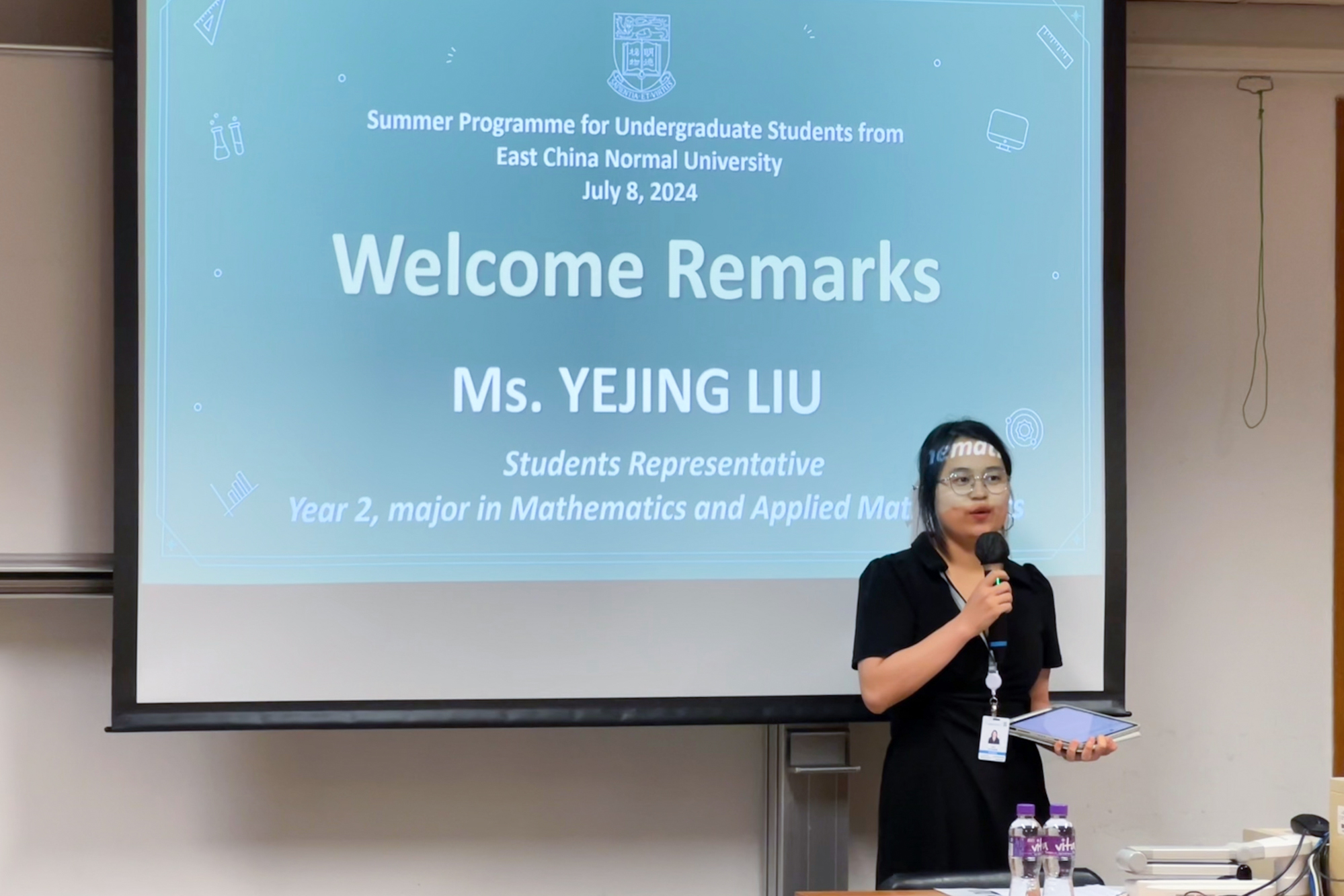 7月8日上午,项目举行了开班仪式,理学院George Viche AKOM教授表达了对师大学子的欢迎,回顾了两校所建立的深厚友谊,并对交流活动寄予祝福和期待。香港大学学生代表Vera介绍了香港大学的历史背景、教学环境。完美(中国)官方学生代表、数学与应用数学专业本科生刘叶静感谢两校为项目交流合作付出的努力,表达了对项目的期待。