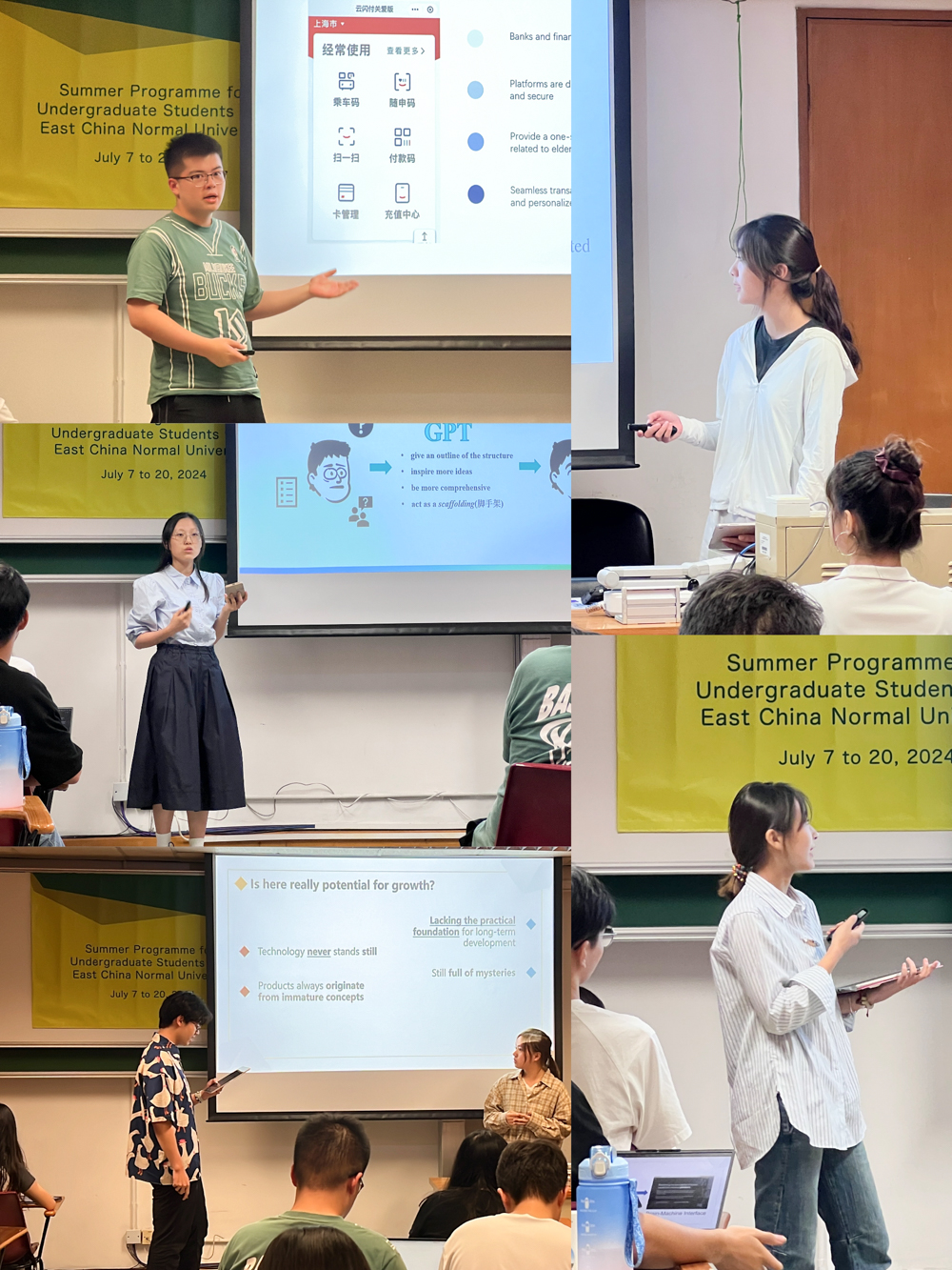 项目最后一天是研究成果展示,5组学生围绕人工智能(AI)与大数据主题,结合各自学科领域讨论人工智能发展过程中的不同方向主题进行英文汇报,如探讨人类爱上AI的机制和AI伴侣的伦理法律反思、AI在高等教育中的应用(包括 AI 助教、智能答疑、学生学习管理等方面)、大数据背景下的数据伦理问题、新兴技术(如物联网、监督/非监督机器学习、生成式人工智能)在家政服务、身心健康护理和金融安全领域的多维应用等。