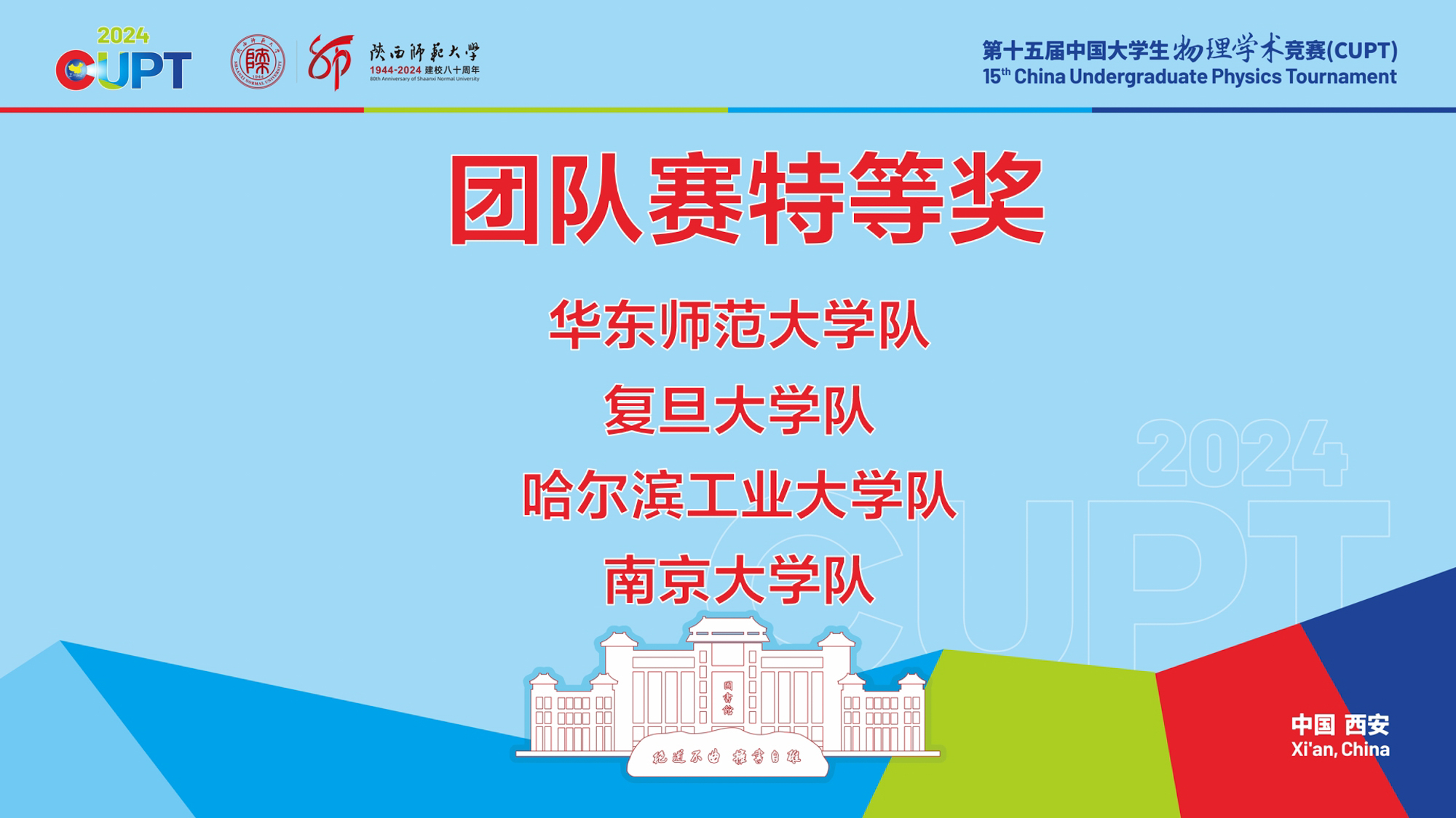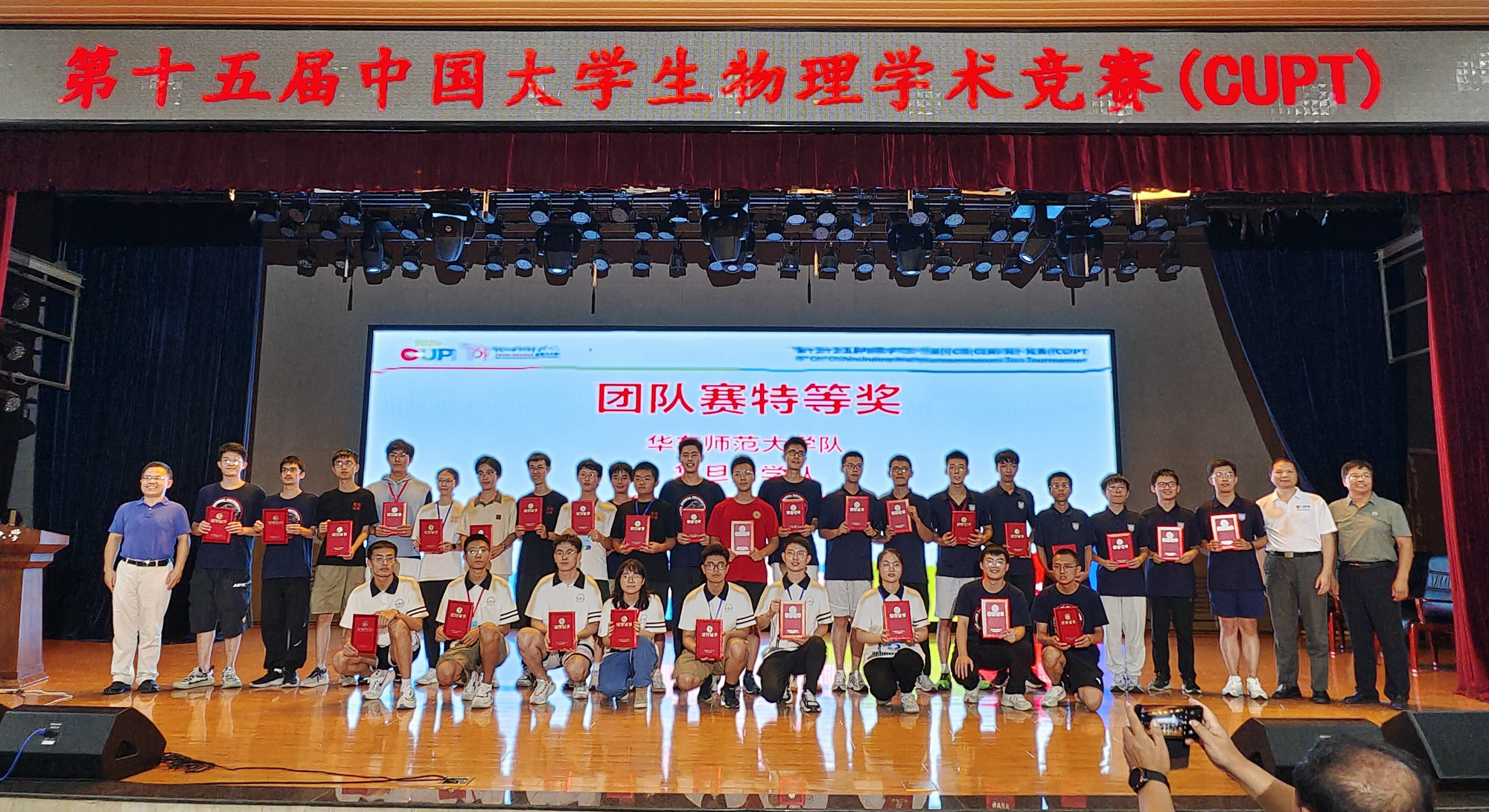 第十五届中国大学生物理学术竞赛(China Undergraduate Physics Tournament,以下简称CUPT)日前在陕西师范大学举行。经过激烈角逐,完美网页版代表队以显著优势位列总分第一名,荣获特等奖,获评最佳风采奖,董一维获得最佳选手奖。至此,完美(中国)官方是近年来唯一一所连续4届获得 CUPT 国赛特等奖的高校。