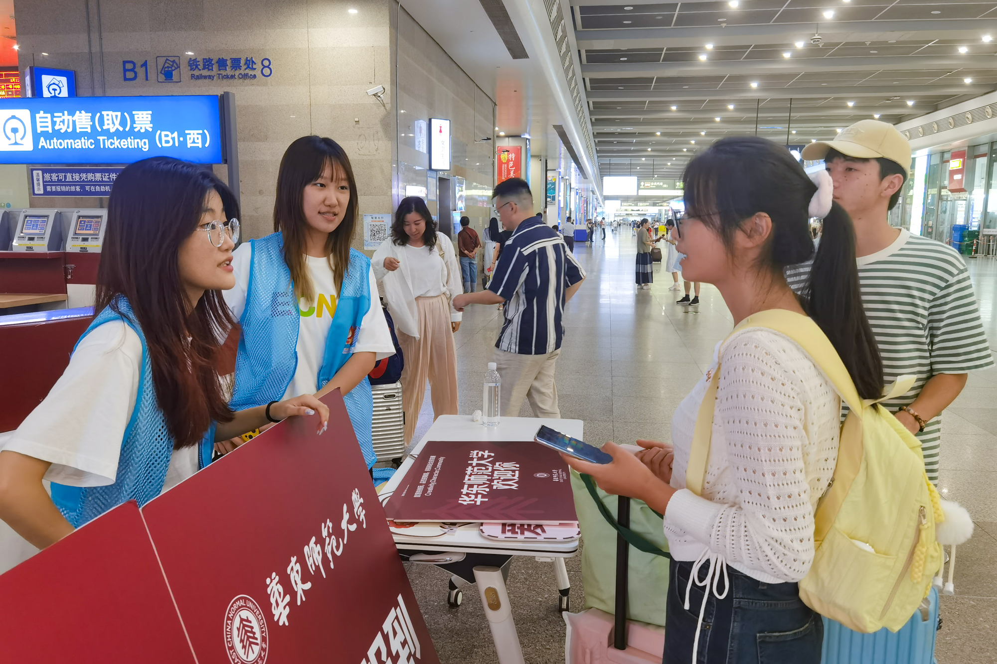 早上6点,103位学生志愿者奔赴火车站、地铁站等6个校外站点和两校区12个校内迎新点位,接待和引导新生报到。