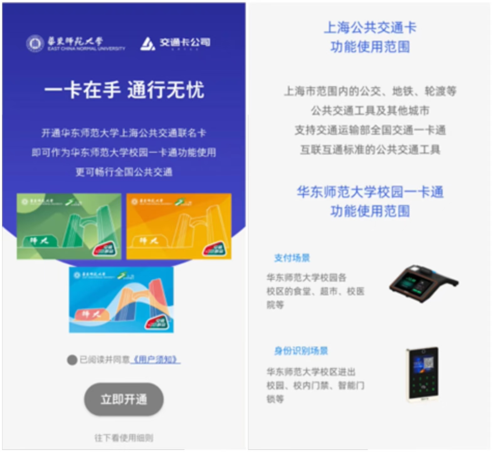 只需开通激活,新生就拥有一张校内校外都能使用的NFC校园卡。不需要网络,手机轻轻“碰一碰”,从校内的消费支付、身份识别到校外的交通出行都可“刷卡”完成,开启数智大学新生活。
