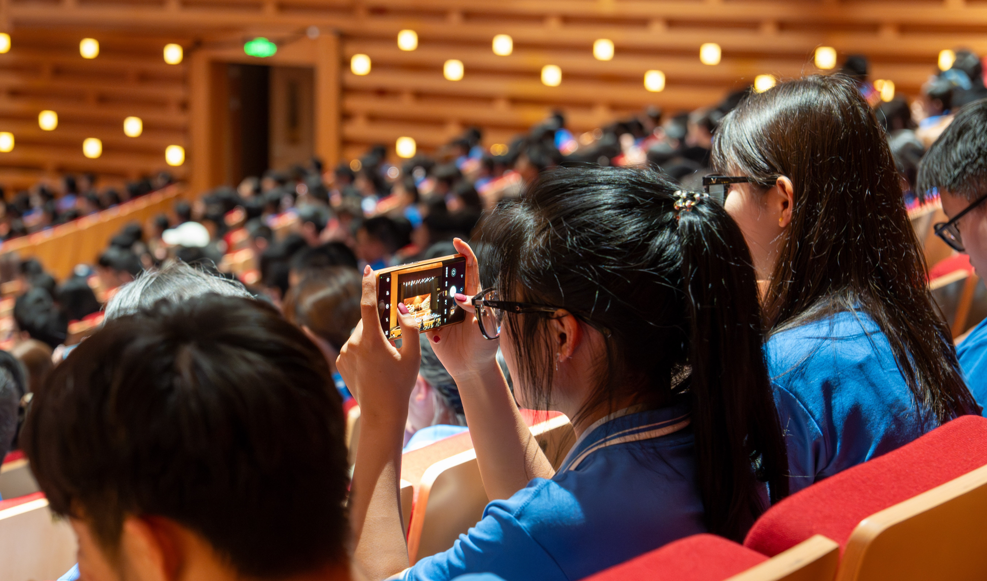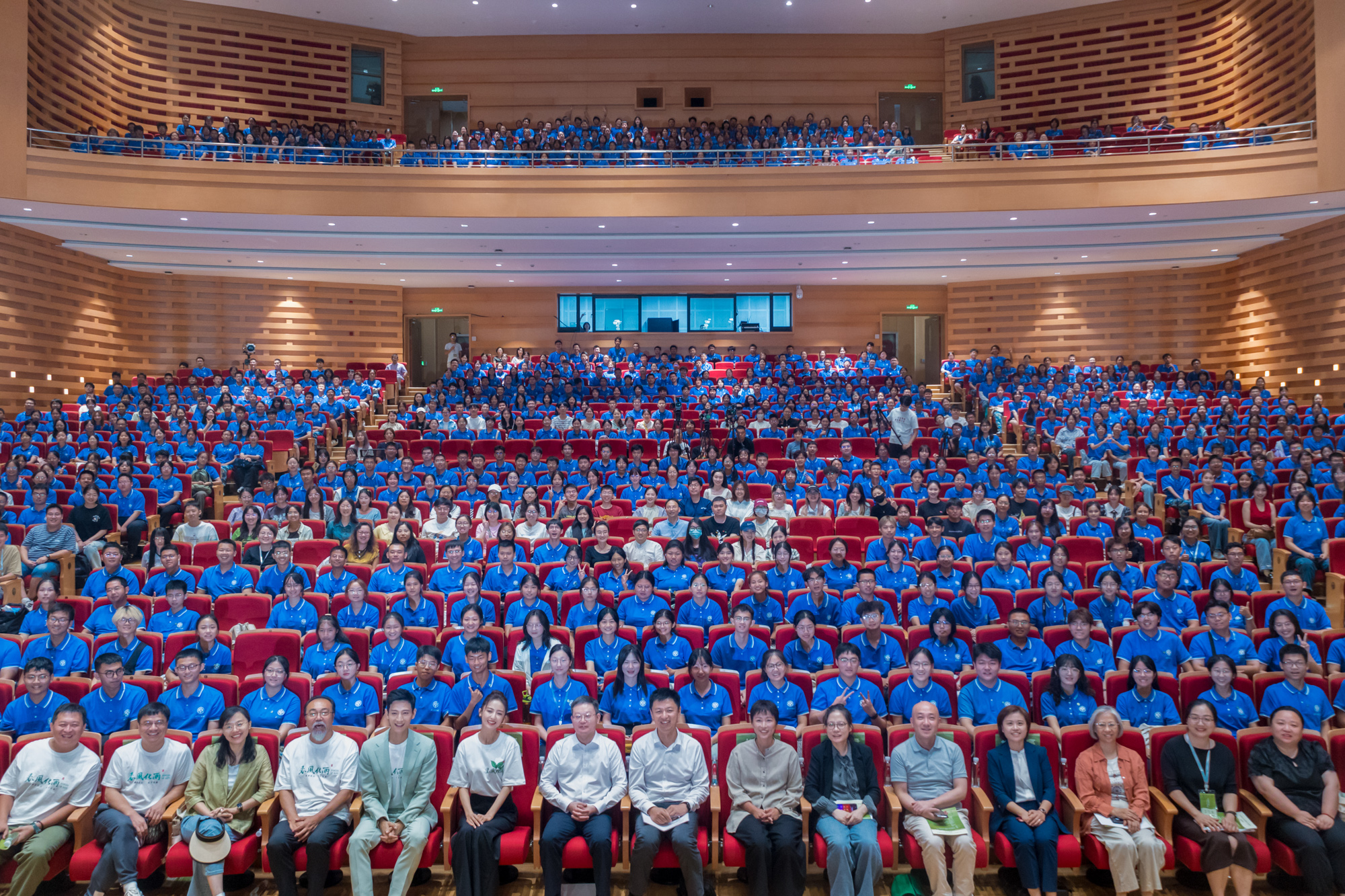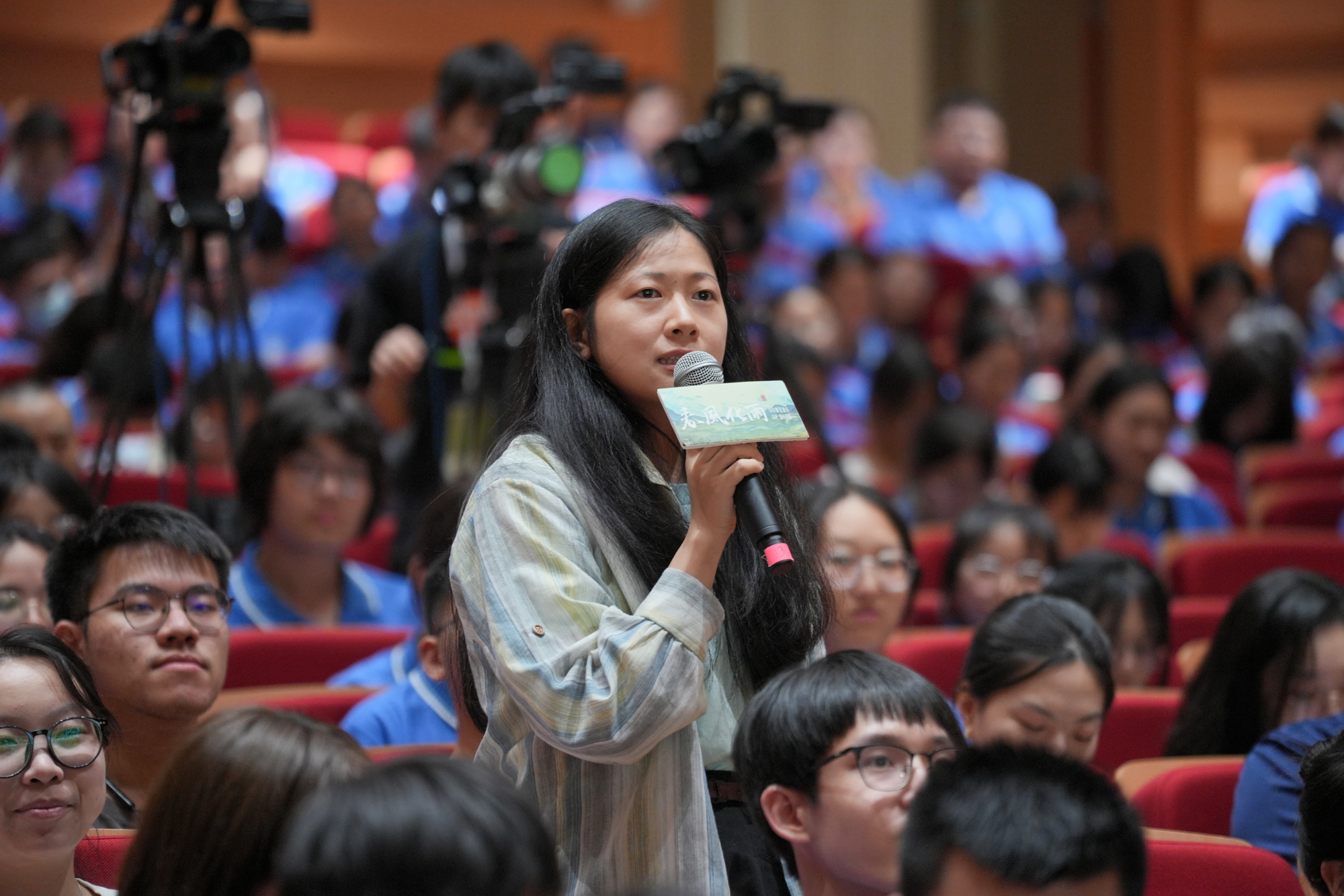 850余名身着孟宪承书院文化衫的2024级师范生新生无疑是活动现场最亮眼的存在。这场特别活动对他们而言更是学校精心打造的一场旨在通过思想与艺术对话让广大师生、特别是师范生,感悟教育真谛、明白使命担当和坚定教育理想的大思政课。