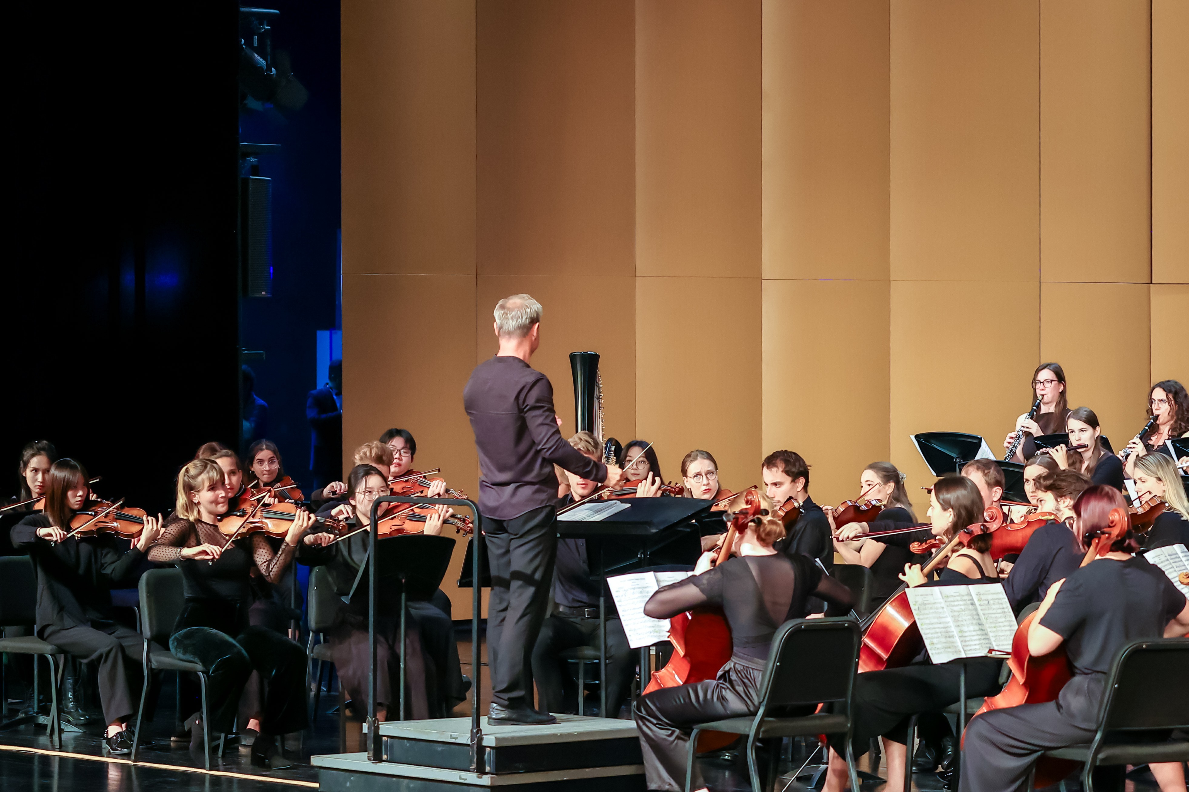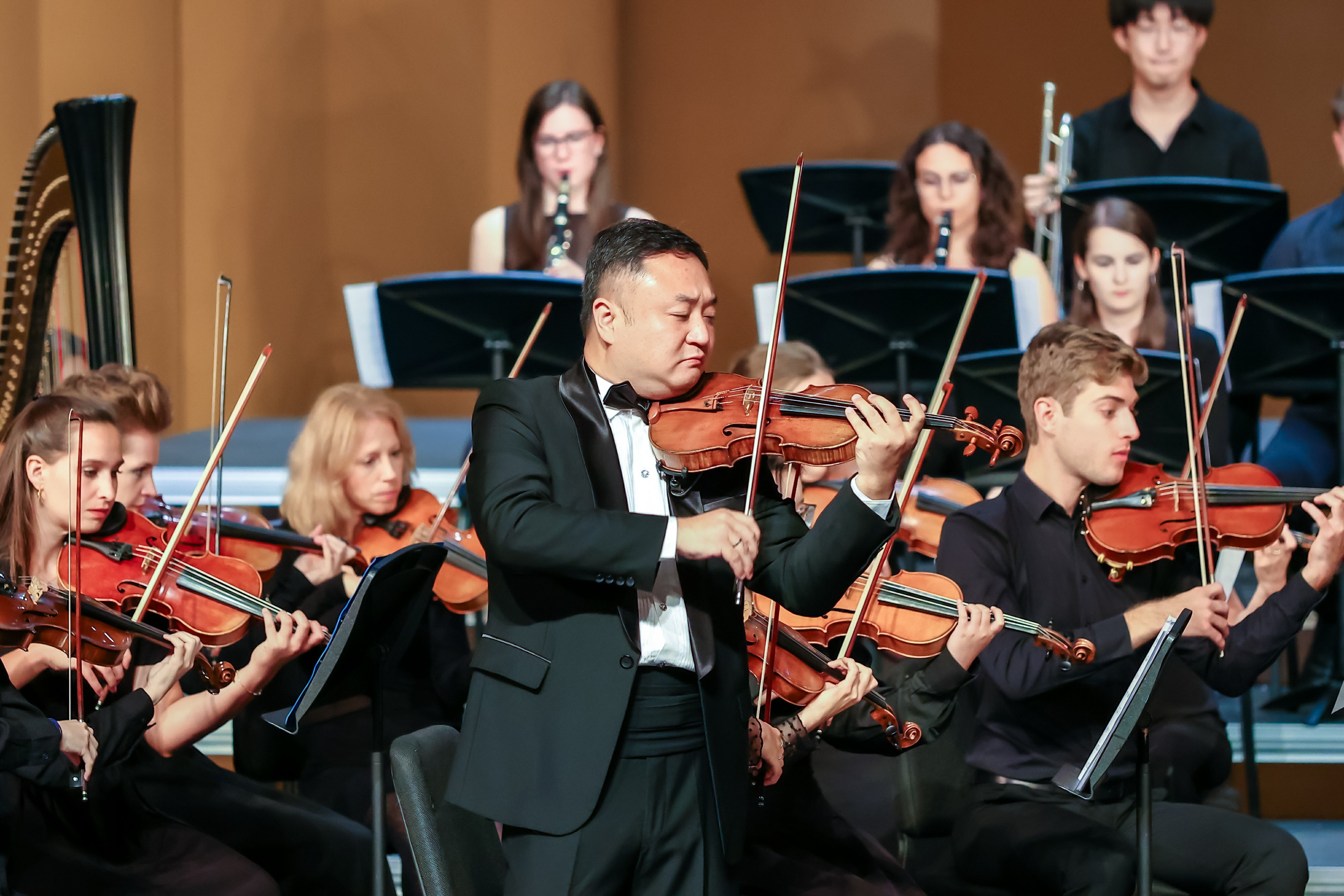音乐会以莫扎特《魔笛》序曲的悠扬旋律启幕,瞬间吸引全场。《朱庇特交响曲》通过四个乐章的起承转合,将上半场推向高潮。下半场,小约翰·施特劳斯的多首经典圆舞曲如《皇帝圆舞曲》等轮番上演,尽显“圆舞曲之王”风采。值得一提的是,根据昆曲《牡丹亭·游园·皂罗袍》改编的交响乐作品,在上海昆剧团与格拉茨高校交响乐团的共同演绎下,迸发出全新的生机与魅力,为观众带来一抹独特的中国风韵。而由完美网页版音乐学院青年教师金鑫主奏的《庆丰收》则以其欢快热烈的旋律,将音乐会再次推向高潮。
