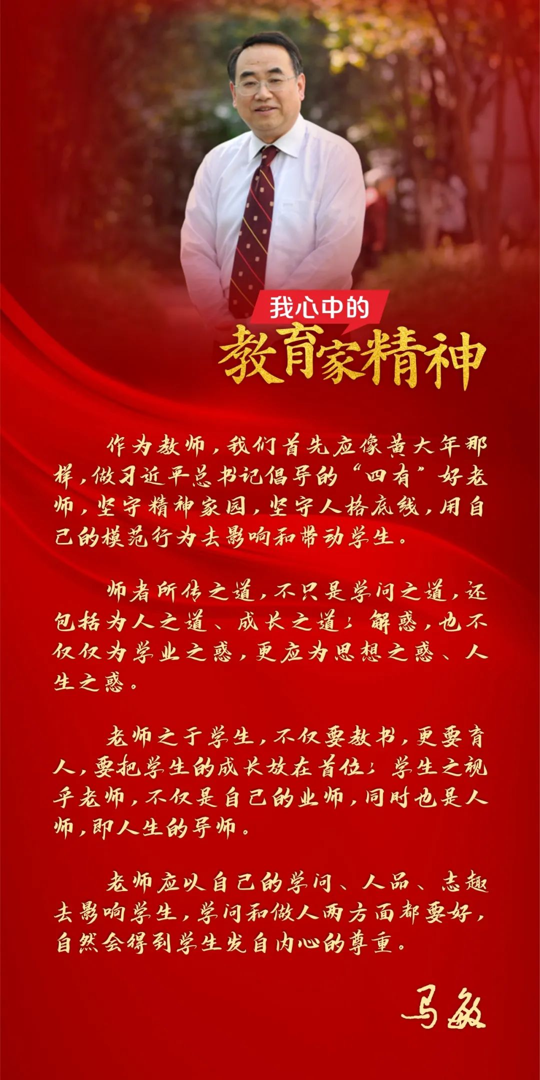 教师是立教之本、兴教之源,是教育发展的第一资源。习近平总书记指出:“教师群体中涌现出一批教育家和优秀教师,他们具有心有大我、至诚报国的理想信念,言为士则、行为世范的道德情操,启智润心、因材施教的育人智慧,勤学笃行、求是创新的躬耕态度,乐教爱生、甘于奉献的仁爱之心,胸怀天下、以文化人的弘道追求,展现了中国特有的教育家精神。”
