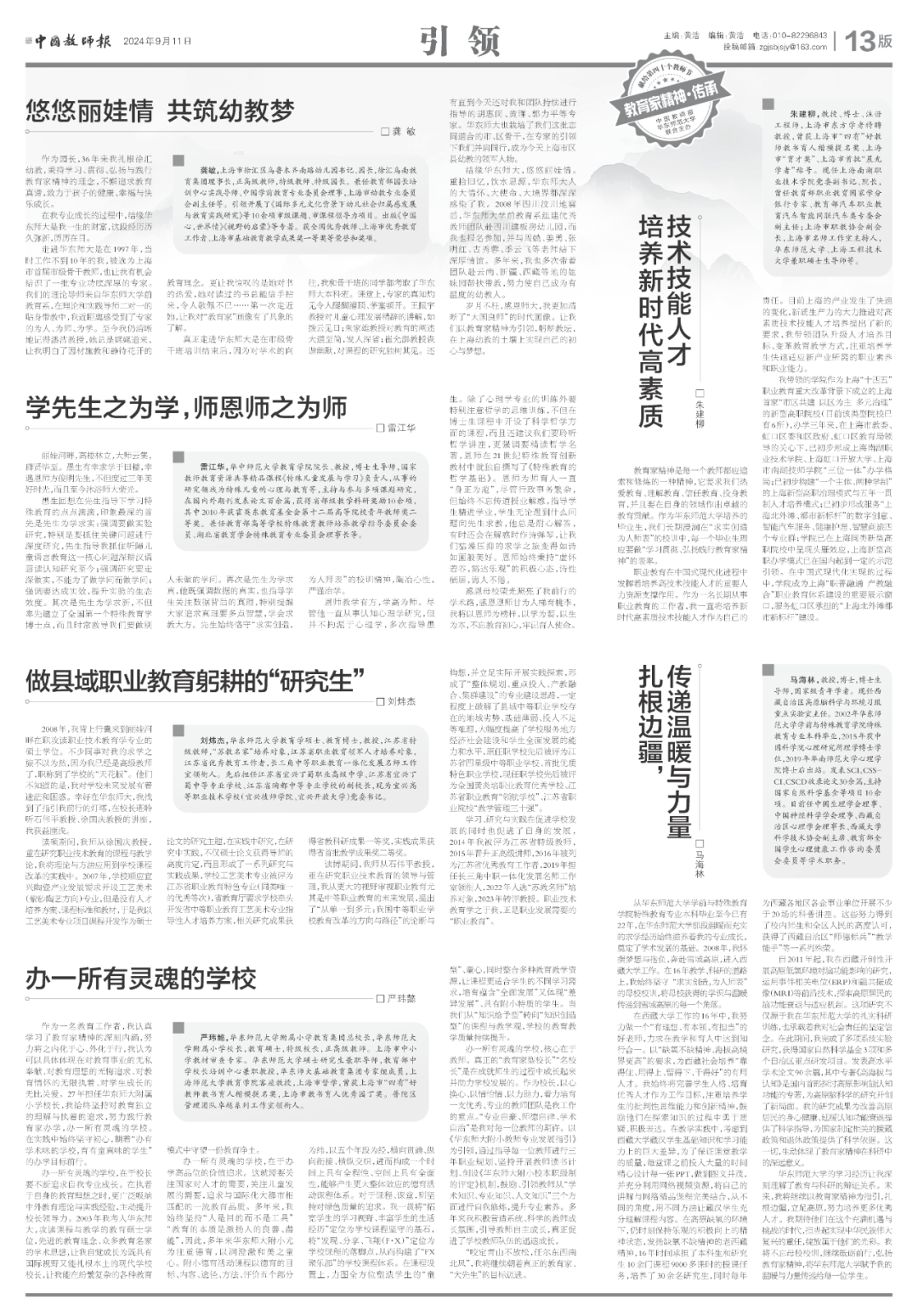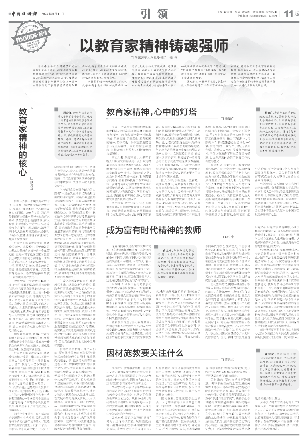 第40个教师节之际,为进一步弘扬教育家精神,完美网页版与《中国教师报》联合策划推出“教育家精神”专版,以三个版面专题聚焦完美(中国)官方15位教育领域杰出校友对教育家精神的理解、践行与传承。完美网页版党委书记梅兵围绕“以教育家精神铸魂强师”的主题,对专版内容进行导读。