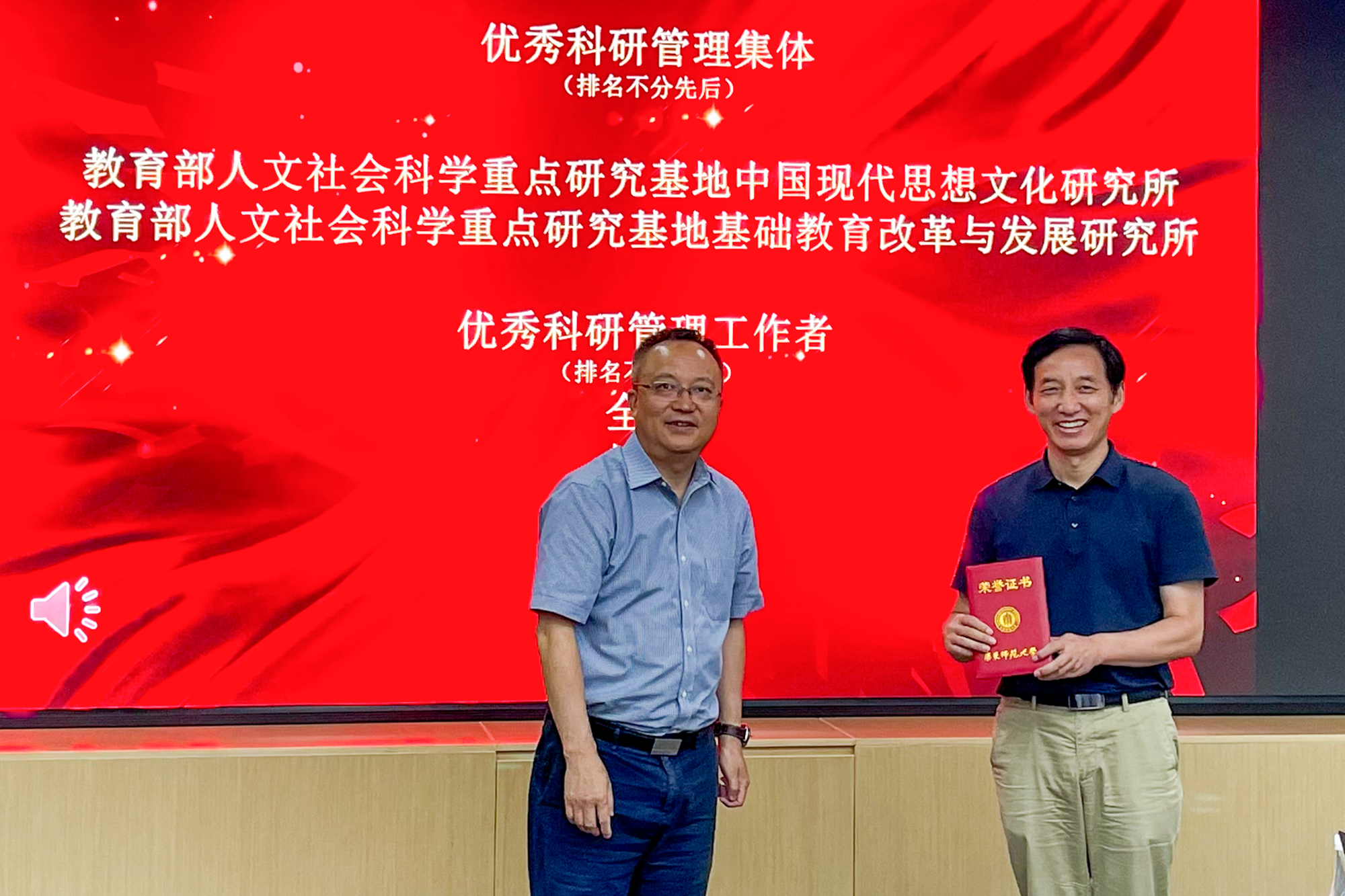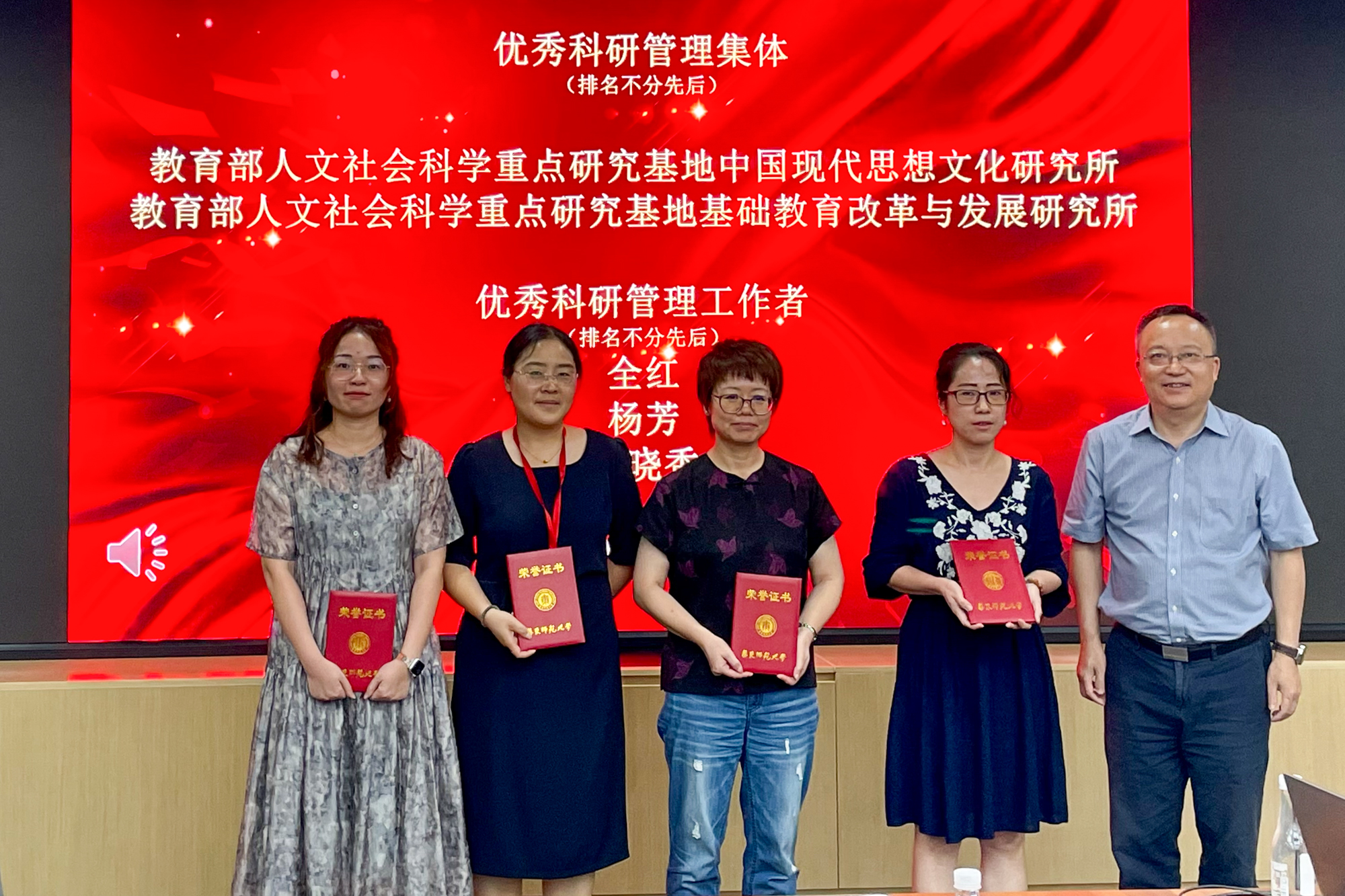 会上对2023年度完美网页版优秀科研管理集体与优秀管理工作者进行了表彰,教育部人文社会科学重点研究基地中国现代思想文化研究所、基础教育改革与发展研究所两家单位获得2023年度优秀科研管理集体称号,全红等5位同志获得2023年度完美网页版优秀科研管理工作者称号。