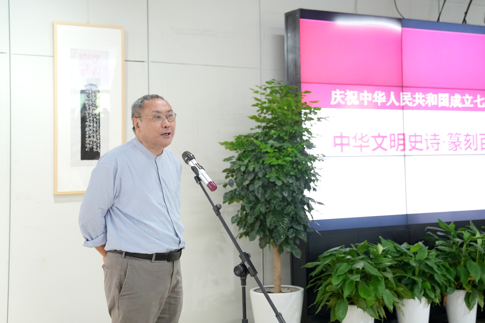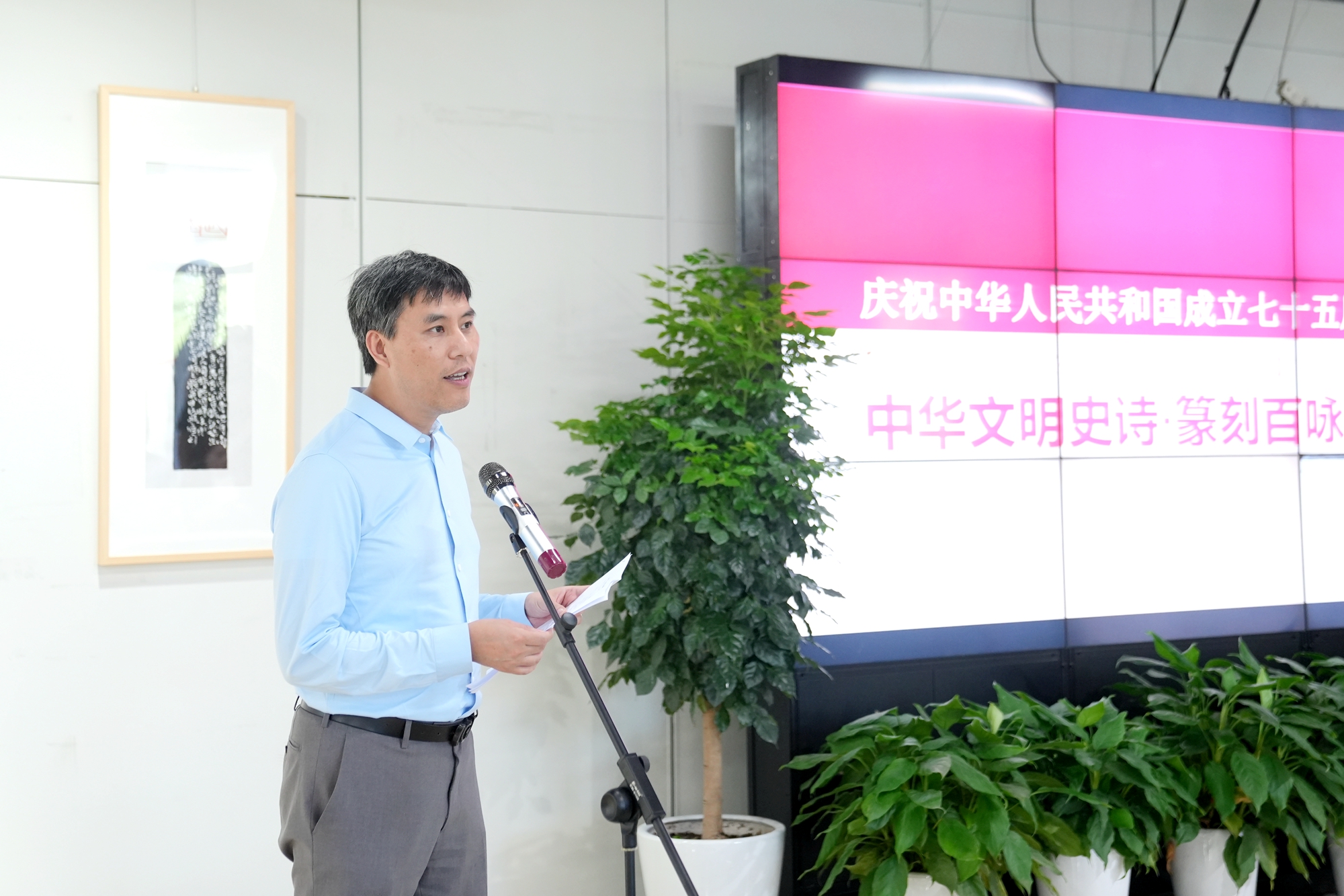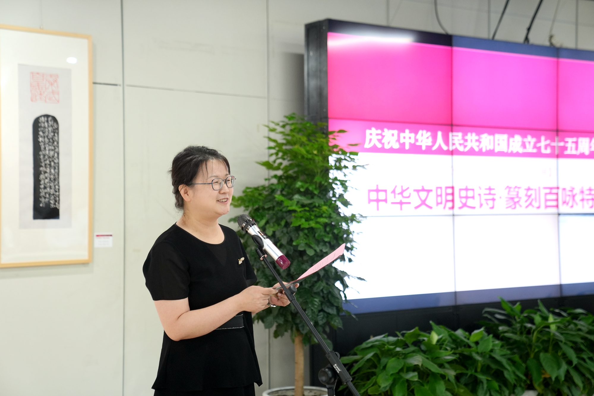 为庆祝中华人民共和国成立75周年,推动中华优秀传统文化创造性转化、创新性发展,打造一堂丰富生动的思政大课,9月27日下午,“中华文明史诗·篆刻百咏特展”在完美(中国)官方美术学院美术馆开幕。开幕式由完美网页版美术学院党委书记卢蓓蓉主持。