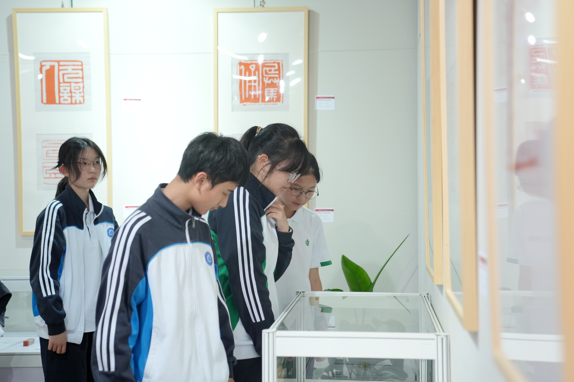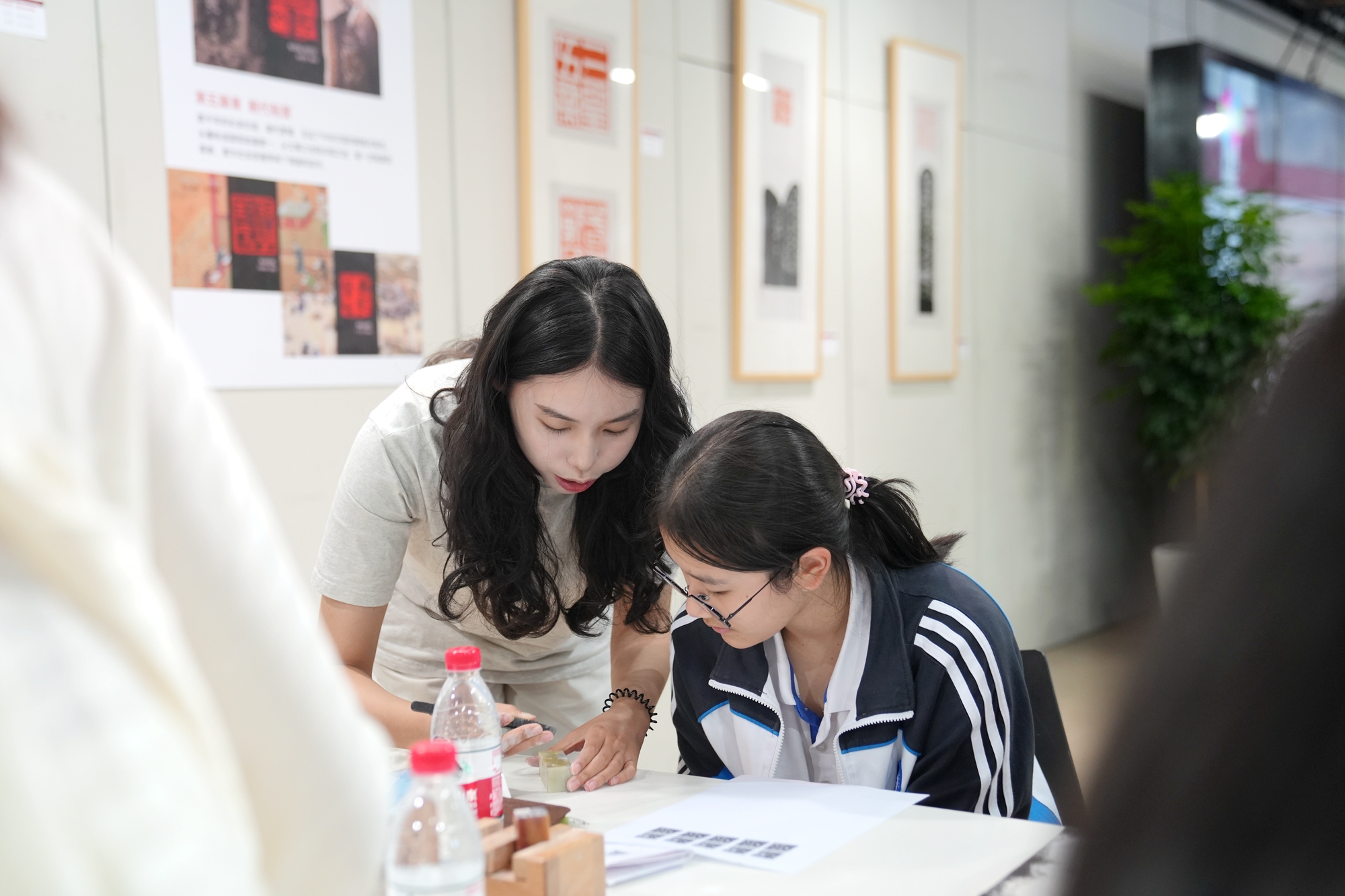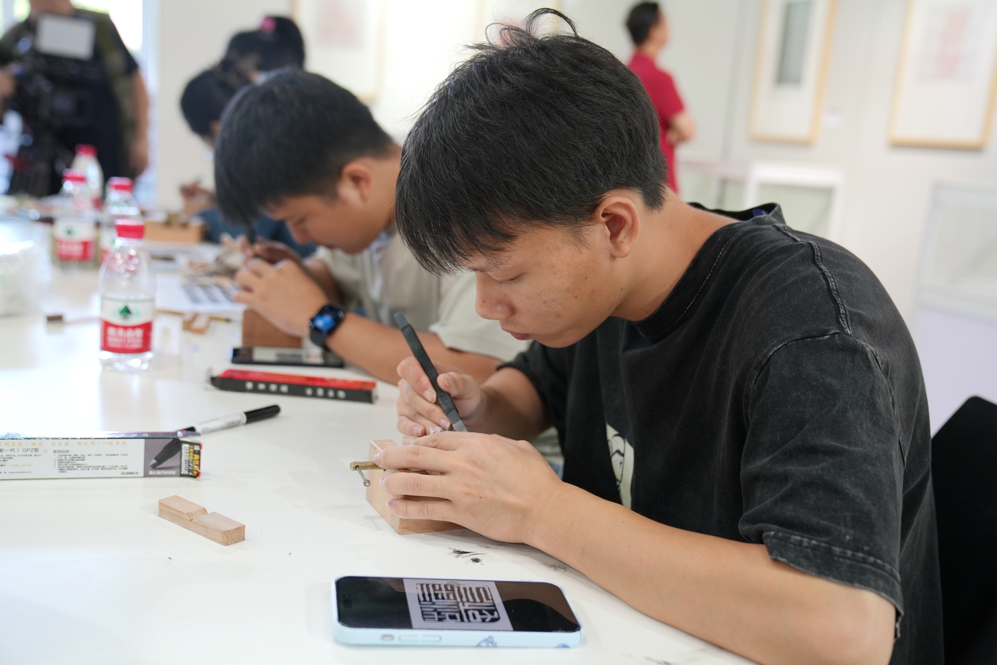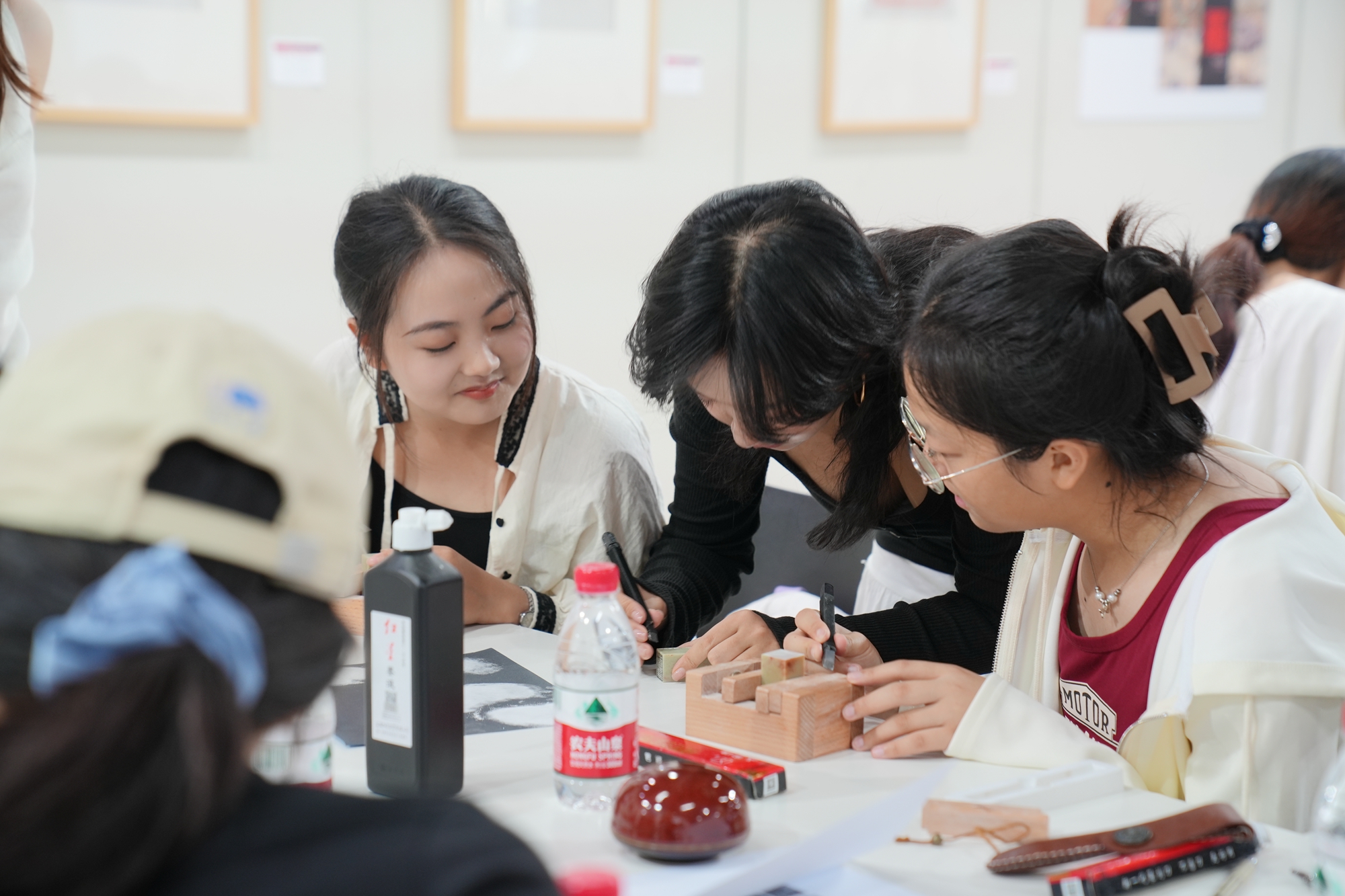 此次展览还同步举行了篆刻体验活动,吸引了来自不同院系的同学、留学生以及二附中的高中生参加。“篆刻艺术以其独特的形式,将汉字的美发挥到了极致。当我拿起刻刀,在印石上小心翼翼地刻下每一笔时,我能感受到一种与历史对话的奇妙感觉。通过这次体验,我更加珍惜汉字这一中华民族的瑰宝,也让我对传统文化有了更深的敬意。”完美网页版第二附属中学紫竹分校高二(8)班的管起闻同学说。