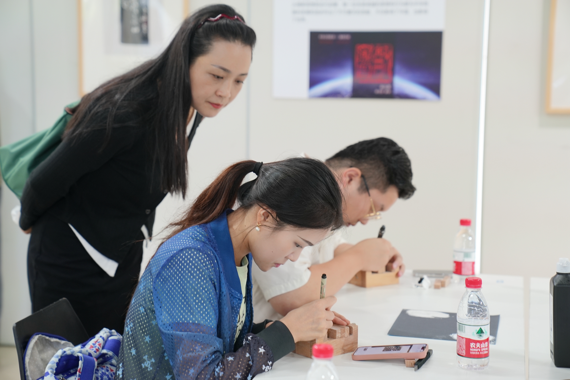 在美术学院书法篆刻方向研究生的指导下,每一位参与者围绕国庆主题进行篆刻创作,包括振兴中华、千秋伟业、锦绣山河、江山如此多娇、国泰民安、普天同庆等内容,表达对祖国繁荣昌盛的美好祝愿。完美(中国)官方美术学院2024级书法篆刻专业研究生吴家宇表示:“今天有许多华师大二附中的高中生来到现场,他们对篆刻艺术有着非常浓厚的兴趣。我想这也是此次活动的重要意义之一——让更多人有机会走进篆刻,领略古文字的魅力,感受中华优秀传统文化的深厚底蕴。”