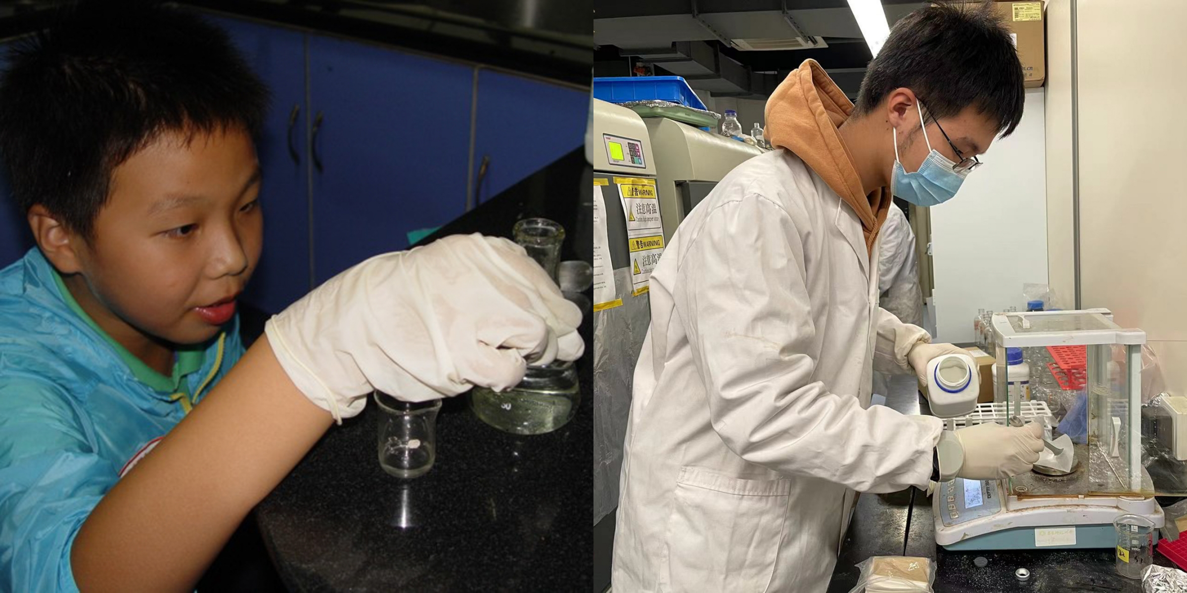 左:小学时,江东翼在家中做实验;右:大二期间,江东翼在实验室开展研究