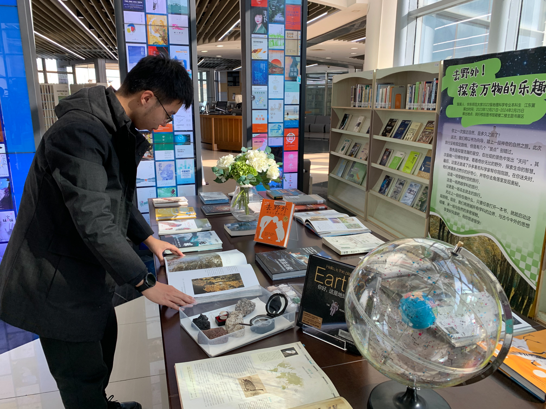 跨越不同学科的边界能产生许多新的思考,不少书就是这样启发了他。江东翼希望让更多人也能感受到自然之美、跨学科之美,就在图书馆策划了“去野外:探索自然的乐趣”主题书展。他精心挑选了两百余本好书,并专门设计了展示形式,力求给师生带来不同的阅读体验。书展在两校区分别展览,3个月的时间吸引了诸多师生前来观看。大家饶有兴趣地转动天球仪、触摸岩石标本、翻阅科普图集,激起了不少读者的探索欲。