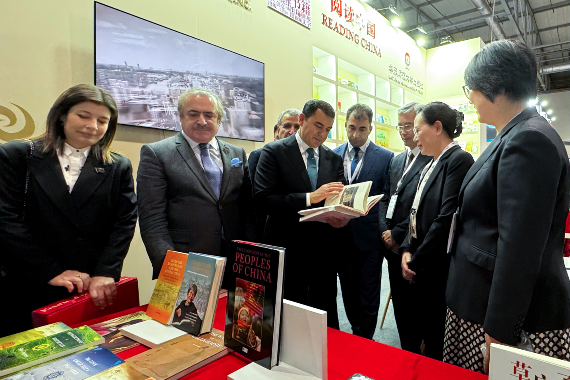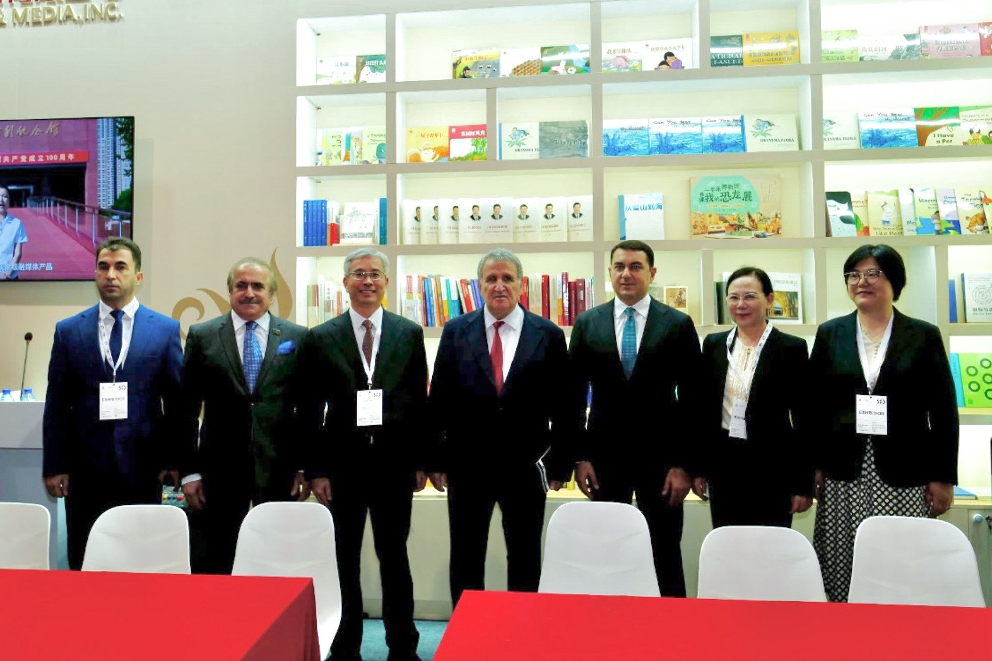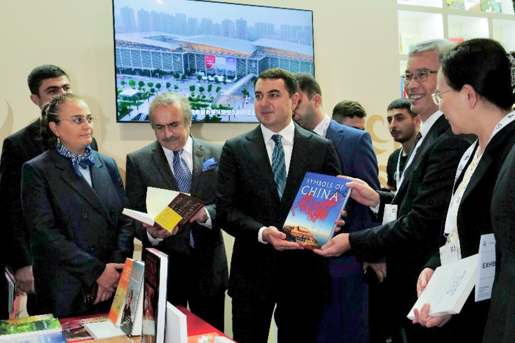 在书展开幕日,阿塞拜疆文化部长阿迪尔·克里姆利(Adil Karimli)来到“阅读中国”展台,了解中国出版代表团的参展情况。中国出版代表团向部长先生赠送了Symbols of China和《70件文物里的中国》。