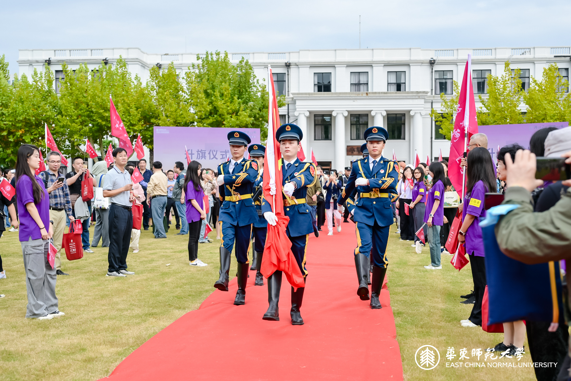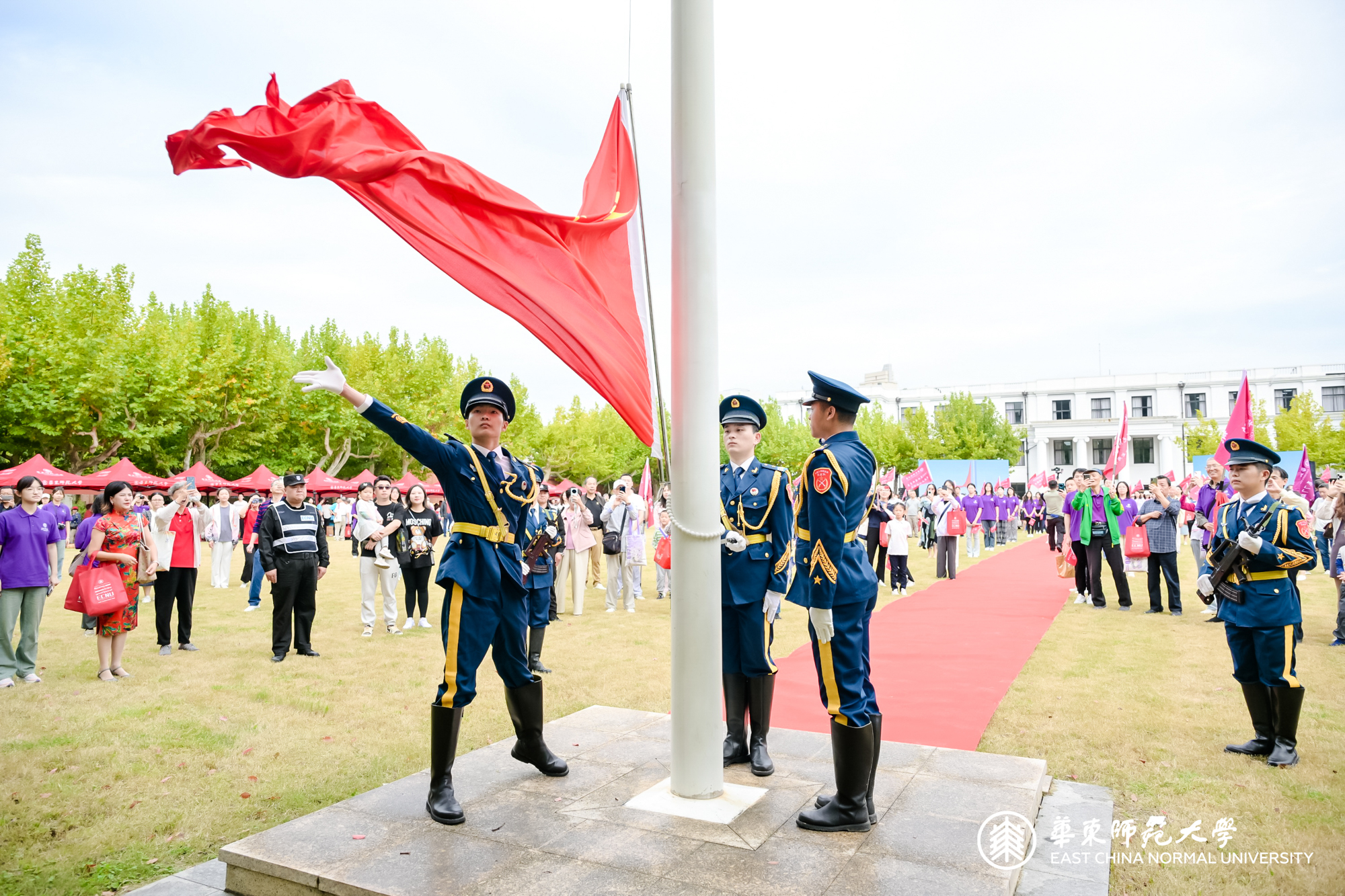 随着一声口令,伴着铿锵有力的脚步声,国旗护卫队高举着国旗,阔步走向国旗台。在庄严的国歌声中,五星红旗冉冉升起,全体校友肃立注目向国旗敬礼。