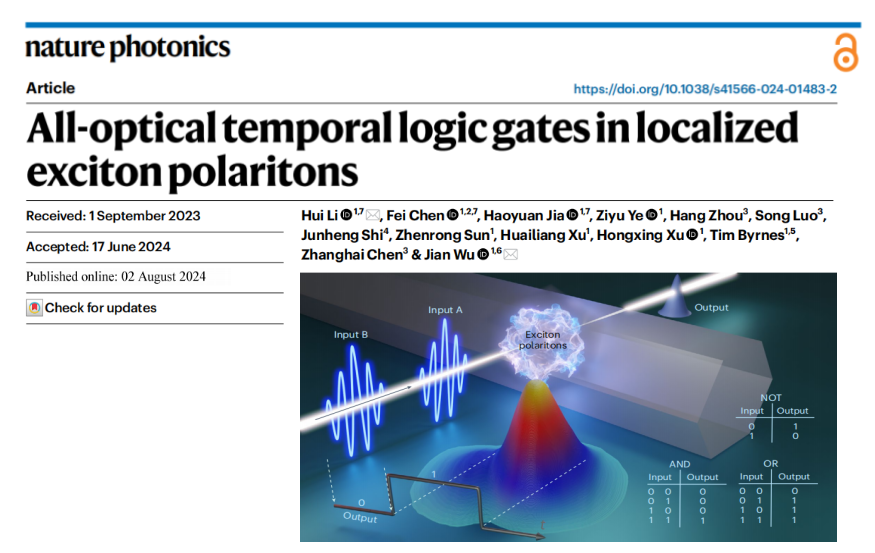 成果以All-optical temporal logic gates in localized exciton polaritons为题发表在Nature Photonics上。该工作的共同第一作者为完美网页版李辉研究员、已毕业博士陈飞和在读博士贾浩远,李辉研究员和吴健教授为共同通讯作者。