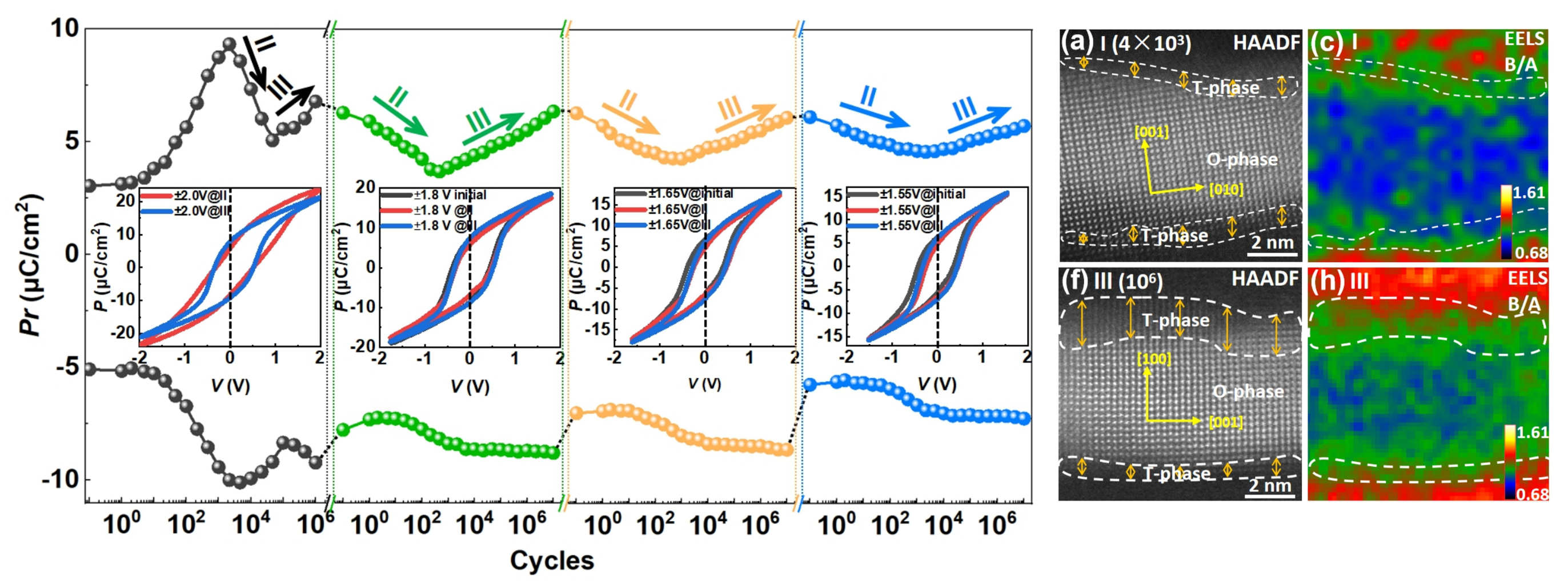 近日,极化材料与器件教育部重点实验室揭示了高温环境铪基铁电器件在电循环过程中的Pr波动效应。报道了高温环境Pr降低源自器件中四方(T)相界面层的形成与增厚,随之而来的Pr上升则是由于T相界面层逐渐形成的氧缺陷和漏电流引起,导致施加于正交(O)相铁电层的有效电场发生波动,被认为是高温环境器件Pr波动的直接原因。研究为评估萤石型铁电器件O相稳定性及氧缺陷演变提供了见解,并提出铪基器件可靠性提升的优化策略。相关成果以The Fluctuation Effect of Remnant Polarization in Hf0.5Zr0.5O2 Capacitors at Elevated Temperatures为题,在微电子器件领域顶级期刊、IEEE电子器件协会旗舰期刊IEEE Electron Device Letters在线发表。论文第一作者为物理与电子科学学院高兆猛博士和郑赟喆博士,通讯作者为成岩教授。