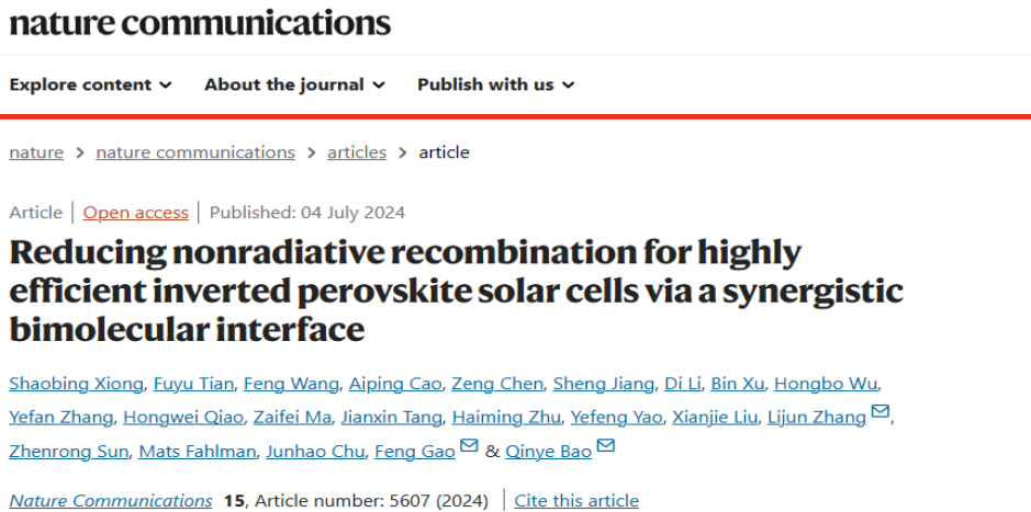 如何有效抑制半导体异质结非辐射复合是实现高性能光电器件的关键科学问题。针对该科学问题,物理与电子科学学院保秦烨教授课题组探索了卤化物半导体/有机半导体异质结的电子结构物性,提出了一种协同双分子(SBI)界面调控策略,构筑出具有优异载流子提取的异质结,并应用于模型器件钙钛矿光伏器件进行验证,创造了非辐射复合损失仅59 meV。该研究成果发表在Nature Communications上,并被选为Editors' Highlights,完美网页版为论文第一完成单位,保秦烨教授为论文通讯作者。