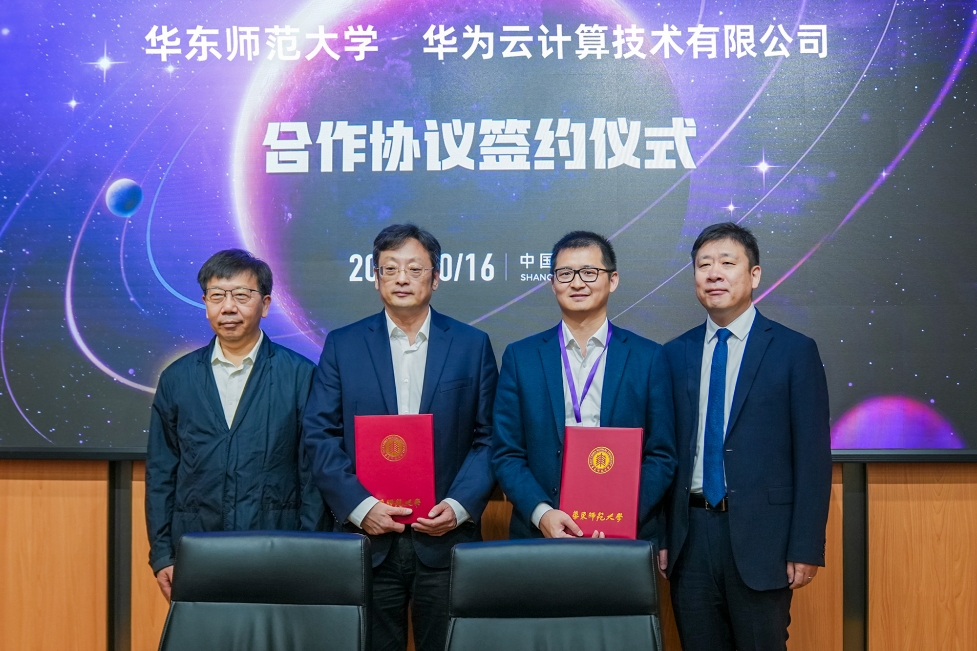 华为云上海总经理张英梗、上海市测绘院科技处处长王伟与学院院长施国跃代表双方分别进行合作签约,华为技术有限公司副总裁、华为云中国区总裁张修征,上海市测绘院副院长赵峰与校长钱旭红院士共同见证。