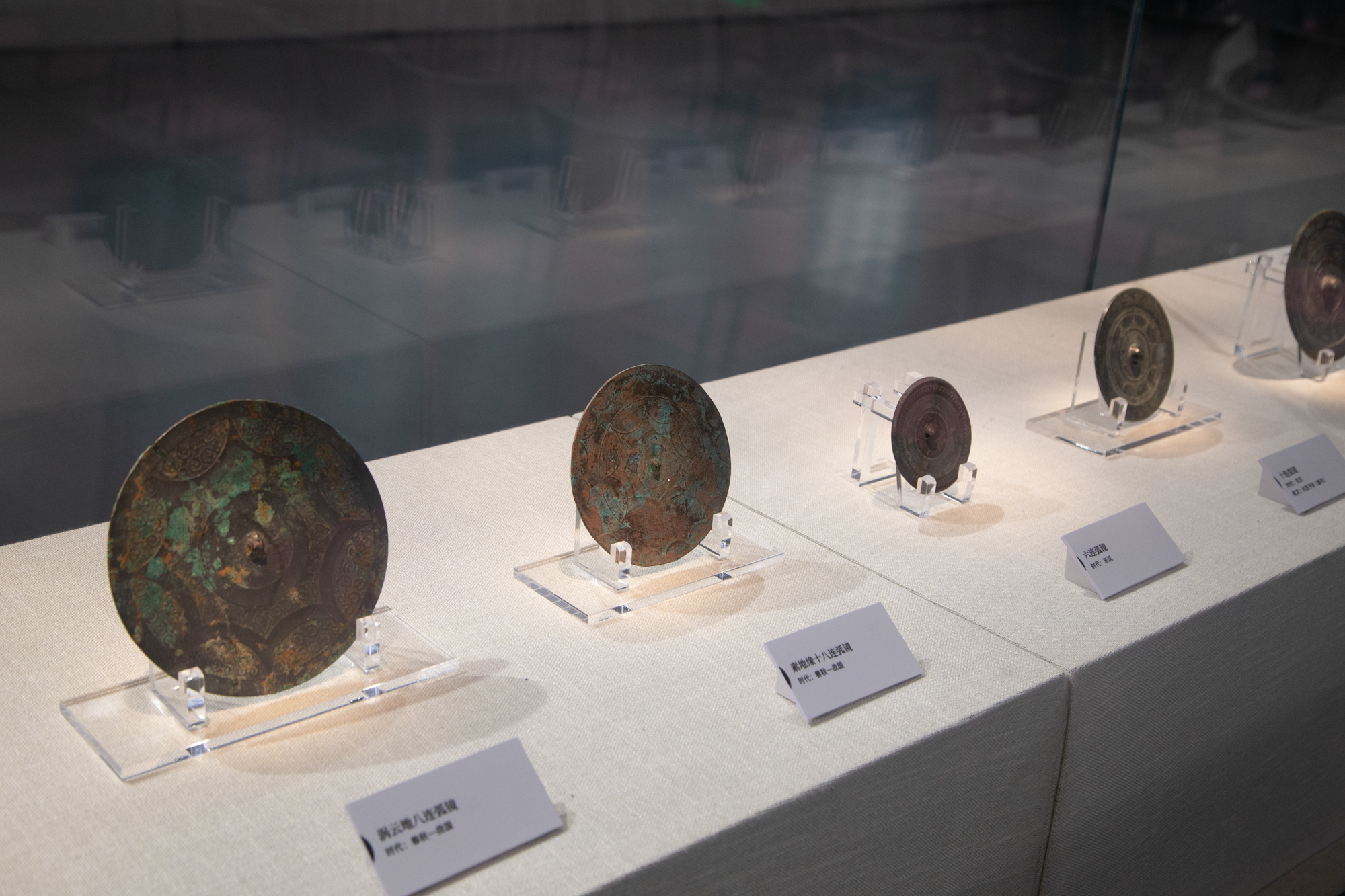本次展览以“秦汉止水”为主题,分“明镜鉴形”“方圆殊趣”“飞龙在天”和“巧刻文章”四个单元展示先秦至秦汉时期的100面珍贵铜镜。这批铜镜,跨越了春秋战国至东汉中晚期至三国六朝,时间跨度长,类型丰富,涵盖了几何纹、动物纹、铭文等多种纹饰类型。