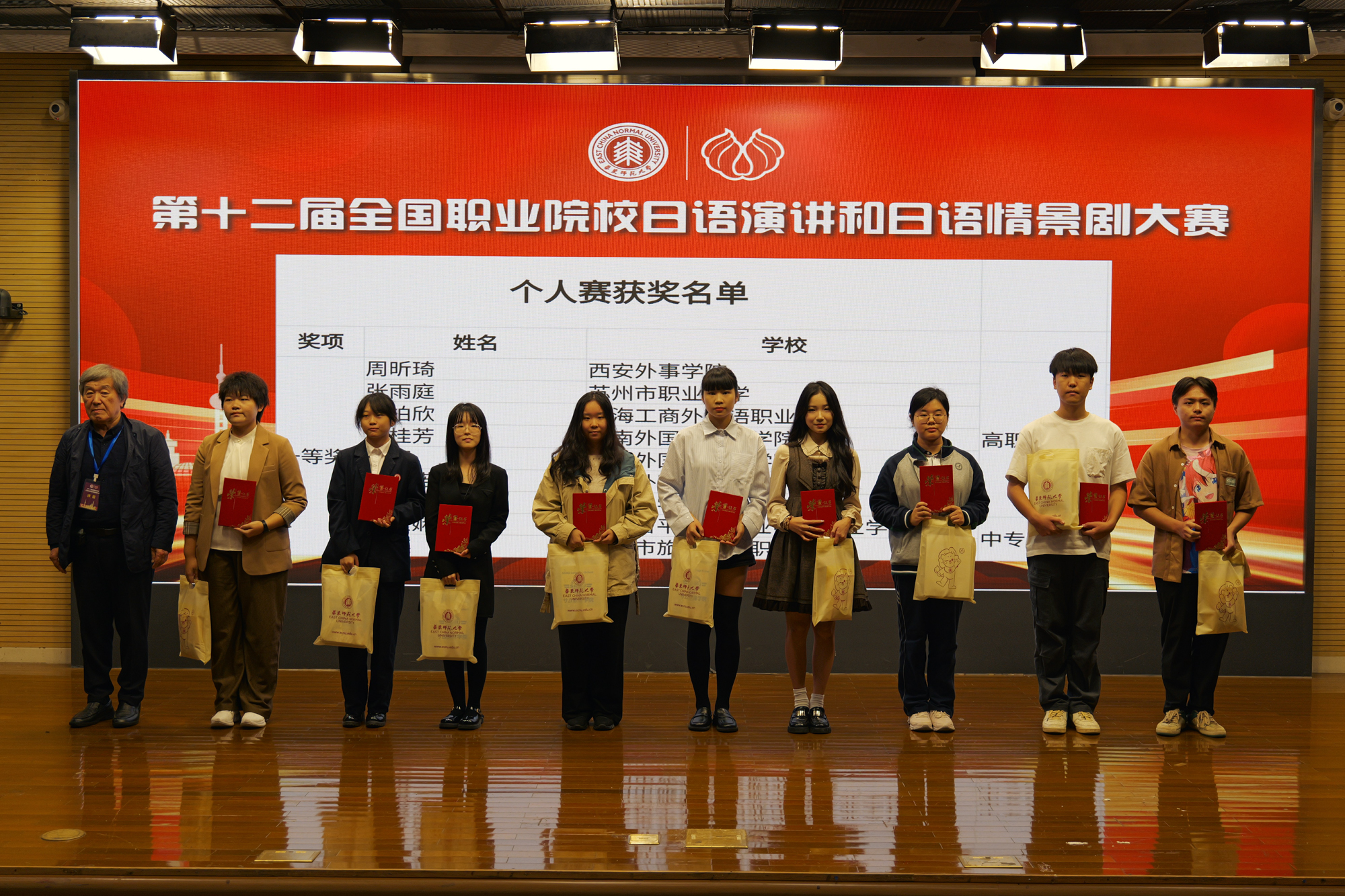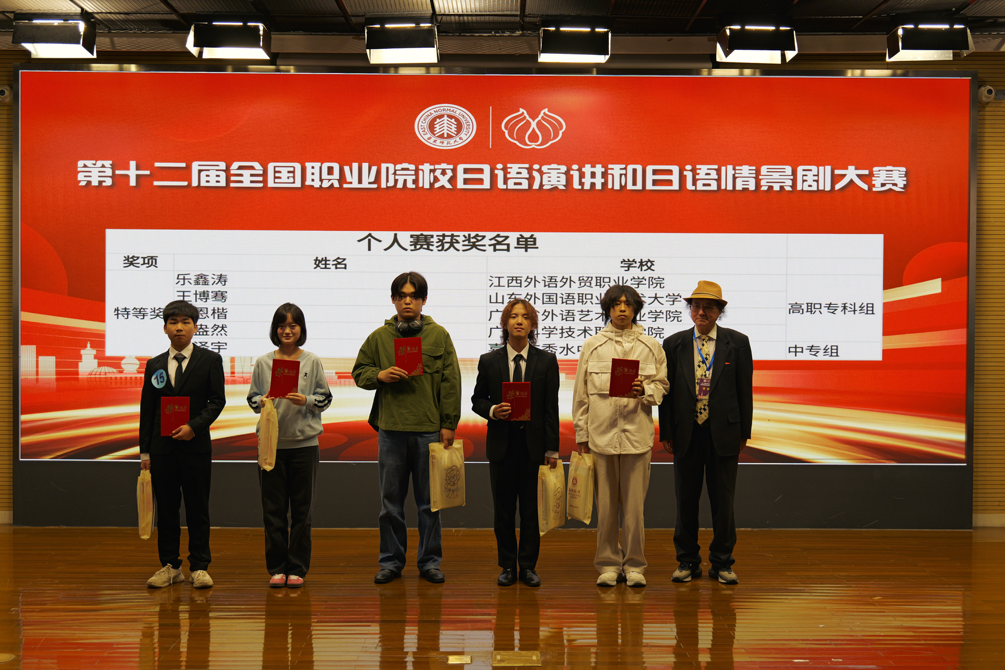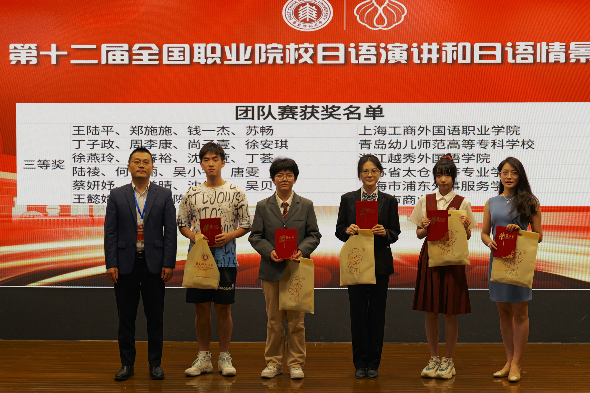 经过紧张激烈的角逐,来自江西外语外贸职业学院、山东外国语职业技术大学、广东省外语艺术职业学院、广东科学技术职业学院、嘉兴市秀水中等专业学校的5名参赛选手获得了演讲比赛的特等奖;浙江省平湖市职业中等专业学校、湖南外国语职业学院、浙江旅游职业学院、武汉职业技术学院、广东科学技术职业学院将职业特色和日语表演有机结合,获得了情景剧大赛的特等奖。