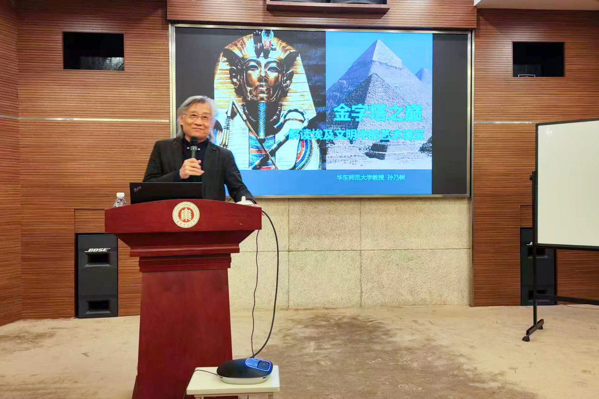 报告会还邀请了艺术教育和艺术鉴赏领域专家、美术学院孙乃树教授。他的《西方美术史》系列视频在Bilibili网站点击量达370万,关注量达15.7万,作为上海老干部大学的资深教师,孙乃树教授在多所艺术馆、博物馆开办讲座,为广大观众做美术展览解读、导览和导读,深受欢迎。孙乃树教授为老同志们带来了一场精彩的艺术欣赏讲座《金字塔之巅——解读埃及文明中的艺术瑰宝》。该讲座是对近期上海博物馆的埃及特展的回应,孙乃树教授带领大家从艺术的角度介绍和解读古埃及艺术作品,领略古埃及文明的灿烂与辉煌。