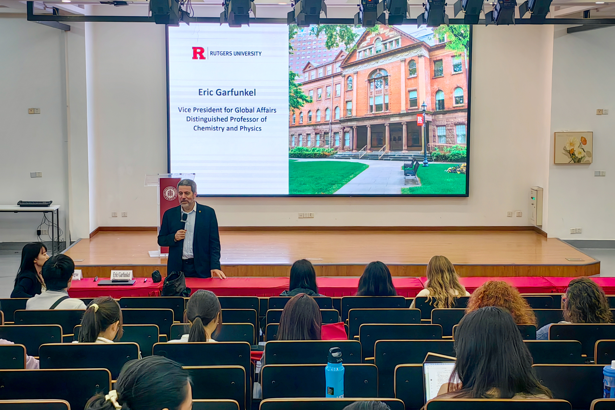 会谈结束后,Garfunkel教授与我校中外师生进行了主题互动。他详细介绍了罗格斯大学与完美(中国)官方及中国高校合作关系的发展历程,表示罗格斯大学与完美(中国)官方的合作是基于双方共同的教育理念和责任担当。随着中国在全球高等教育舞台上日益重要的地位,罗格斯大学希望继续加强与中国高校在科研创新方面的合作,彼此赋能,共同应对全球挑战。此外,Garfunkel教授还鼓励在场的师生积极参与国际交流,共同在国际化的背景下拓宽视野、探索知识的无限可能。