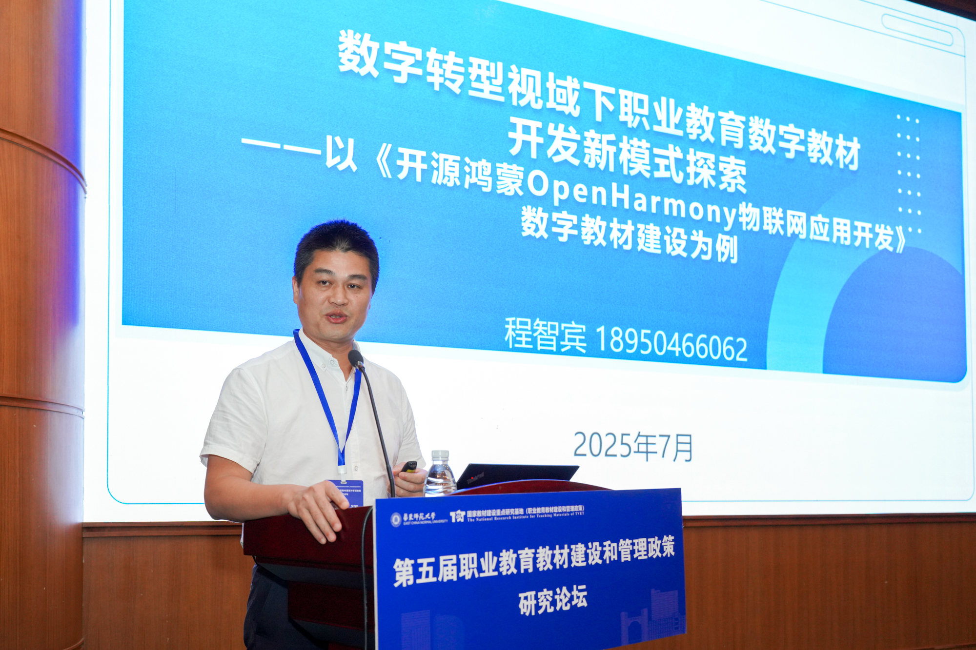 福建信息职业技术学院教务处处长程智宾在《数字转型视域下职业教育数字教材开发新模式探索——以<开源鸿蒙OpenHarmony物联网应用开发>数字教材建设为例》的报告中,通过案例系统介绍了校企深度协同的教材开发模式。在该模式下,教材采用模块化架构和“基础-进阶-拓展”三级任务体系,构建了多模态数字资源与定制教具协同支撑的虚实融合教学生态,以及AI算法驱动的“学习循迹”与“个性化授课”一体化教学平台,实现了学习过程的伴随式数据采集与精准资源推送。