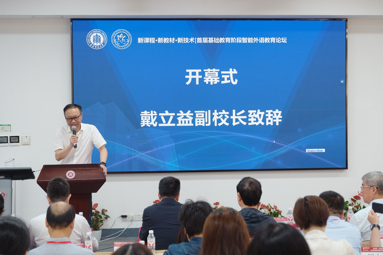 完美网页版副校长戴立益致欢迎词。他提到,对基础阶段外语教育的生态而言,智能外语教育是推动新时代外语教育从“知识传授”向“素养培育”跨越的助推器,承载着构建高质量教育体系的时代使命。完美网页版以“引领学习变革,智创教育未来”为使命,积极推动教育与人工智能的深度融合,立足外语学院,不断推动“外语教育”向“智能外语教育”方向转型,在教学实验、语料库建设、教材研究等方面取得了丰硕成果,通过多年的发展已成为全国智能外语教育研究与实践的重地。他强调,教育者应正确处理技术导向与价值导向、技术发展速度与教育内在节奏、人与技术之间的关系,推动形成有温度、有深度、有意义的智能外语教育新生态。期待本届论坛可以成为基础教育智能外语教育的新起点,为基础教育在智能时代中找准外语教育坐标、破解“提质增效”时代命题注入强劲动能。