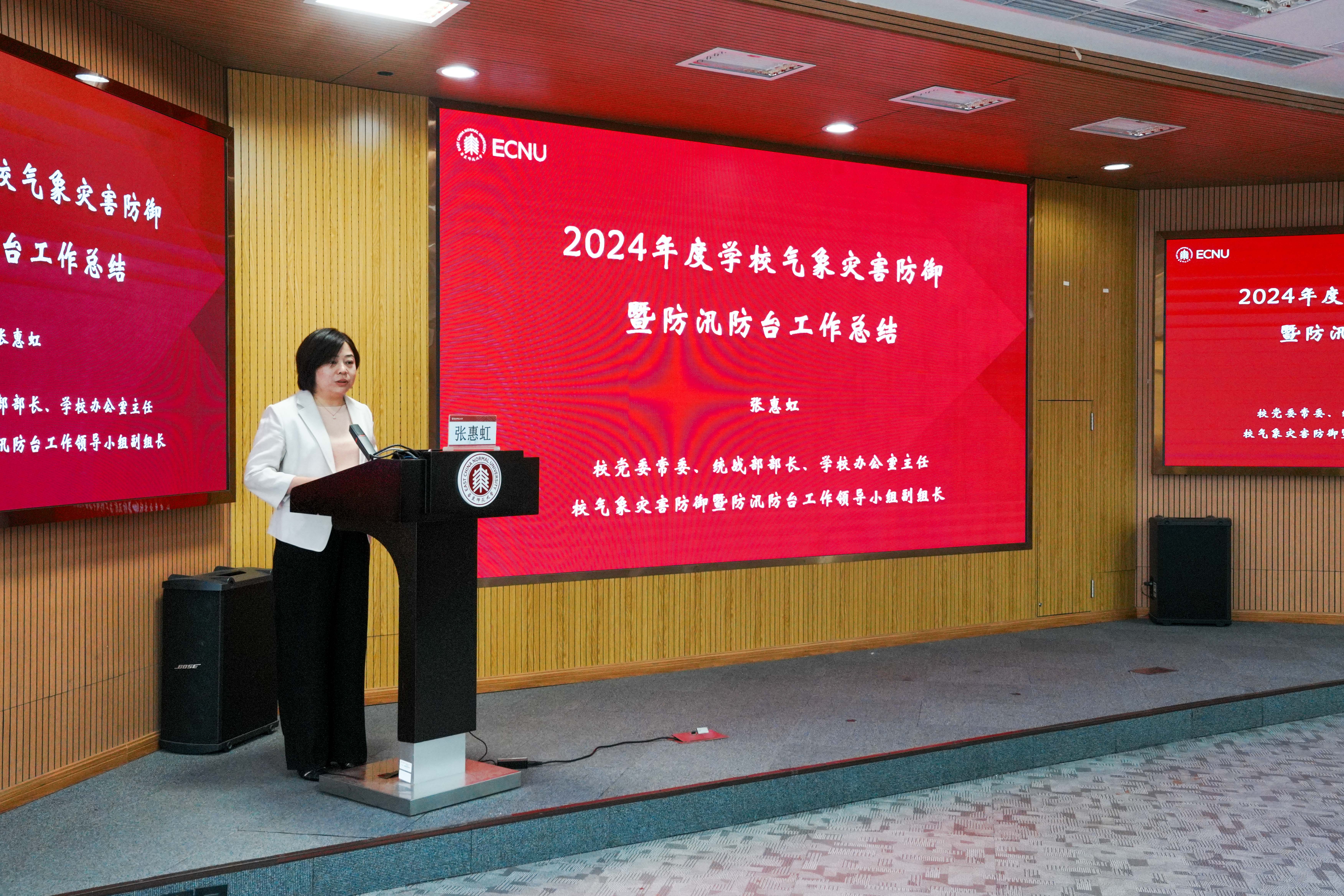 会议伊始,校气象灾害防御暨防汛防台工作领导小组副组长、校党委常委、统战部部长、学校办公室主任张惠虹从防汛防台和极寒天气防御两个方面,对学校2024年相关工作做了回顾和总结。她指出,2024年上海市天气复杂多变,极端天气常态化趋势显著,给气象灾害防御工作带来了诸多困难和挑战,但各部门齐心协力、通力协作、迎难而上,极大程度降低了极端天气对校园运行的不利影响。学校会及时总结往年的经验,牢固树立防患于未然的安全意识,把防汛防台工作落到实处。