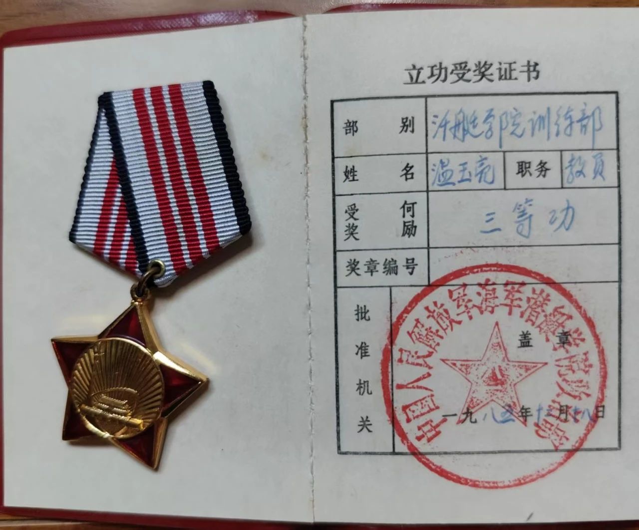 温玉亮曾被中国人民解放军海军潜艇学院授予三等功