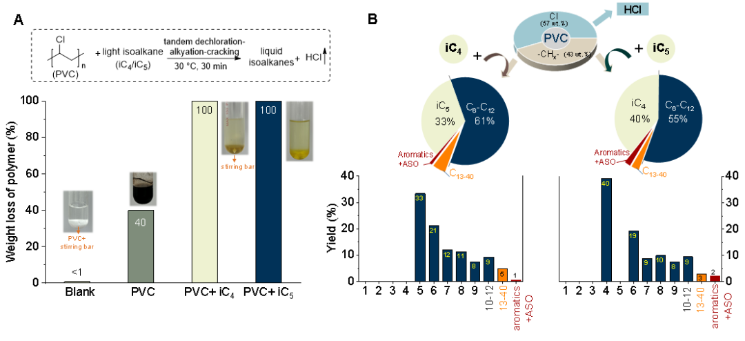 图5. 含氯聚烯烃废塑料可在室温下转化为高值油品与HCl,兼容石化炼厂工艺