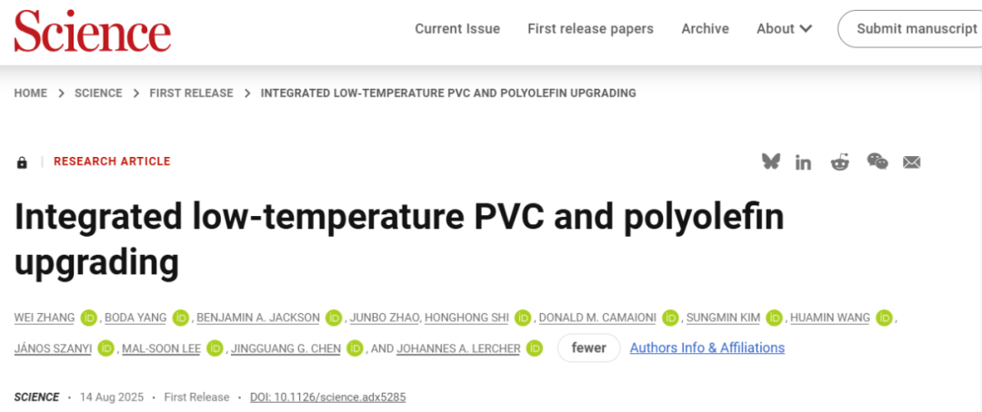 值得一提的是,早在2023年,张伟研究员以第一作者兼通讯作者身份在《Science》发表成果,但当时仅实现了聚烯烃塑料的低温转化。此次最新研究在此基础上进一步突破,不仅将更复杂的PVC废塑料纳入处理范围,还将反应温度降至常温,从而实现对超过60%废塑料的绿色高效回收。