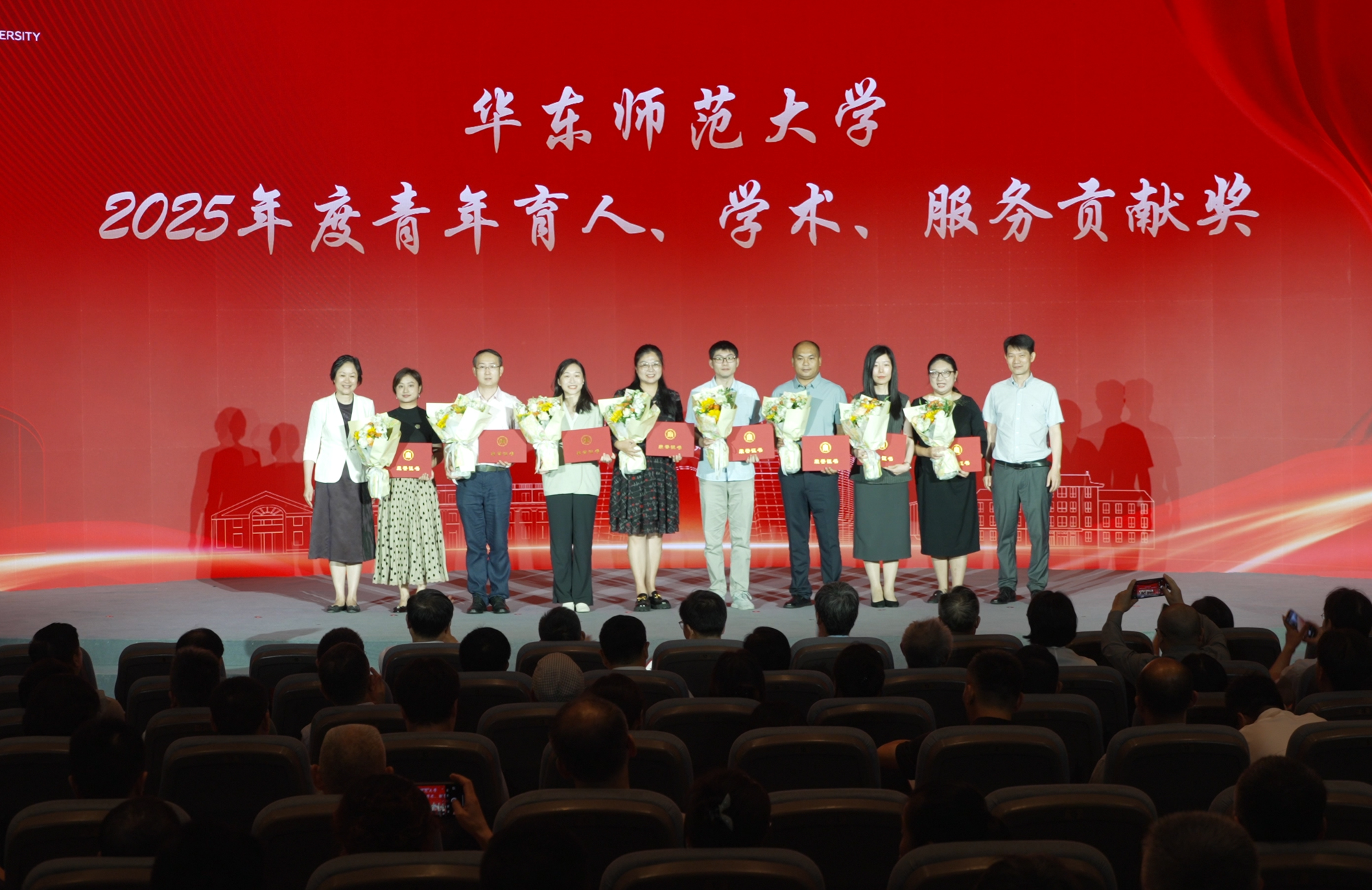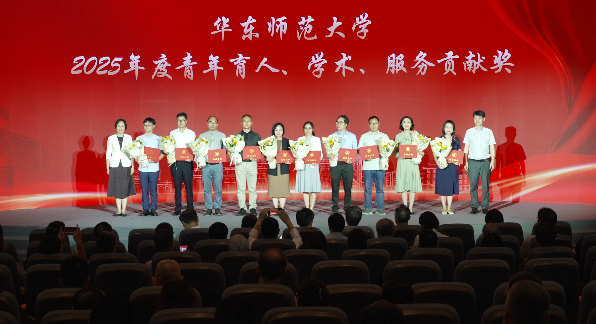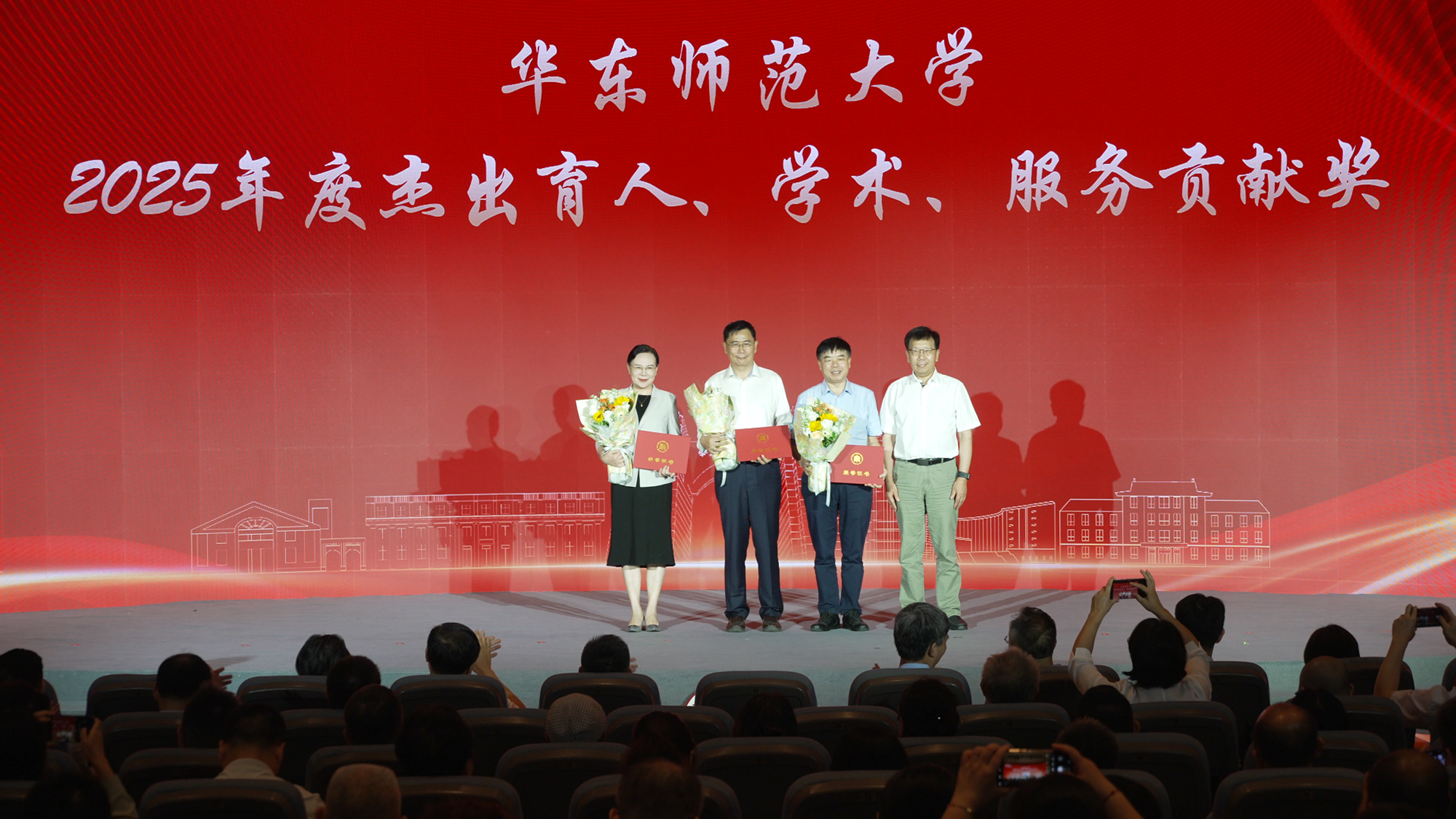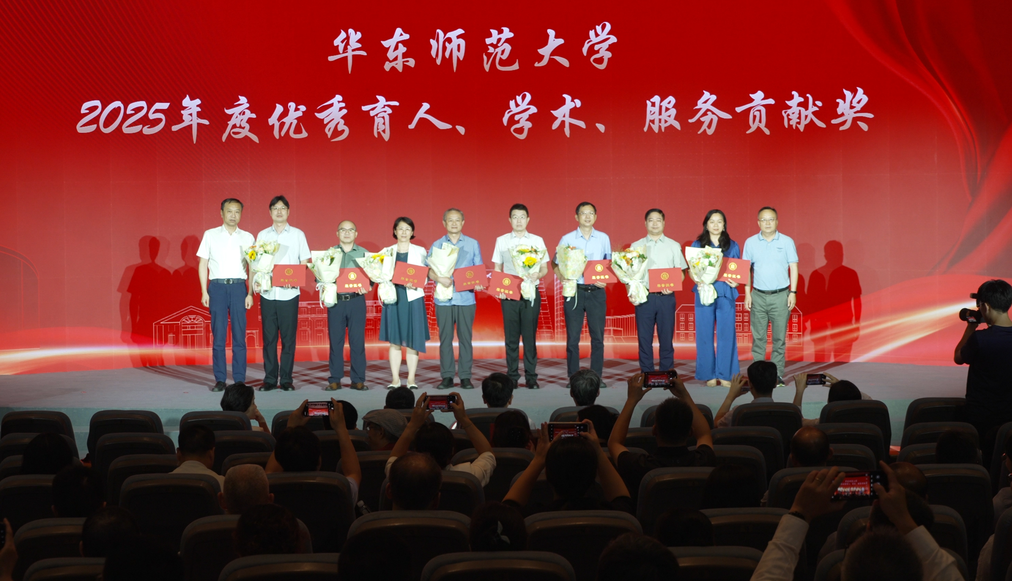 校领导钱旭红、曹友谊、孟钟捷、戴立益、雷启立、程静、吴健分别为获奖教师颁发证书并合影留念。表彰聚焦育人、学术、服务三大核心领域,共评选出15名育人贡献奖、12名学术贡献奖、14名服务贡献奖,获奖教职工依次登台接受表彰。