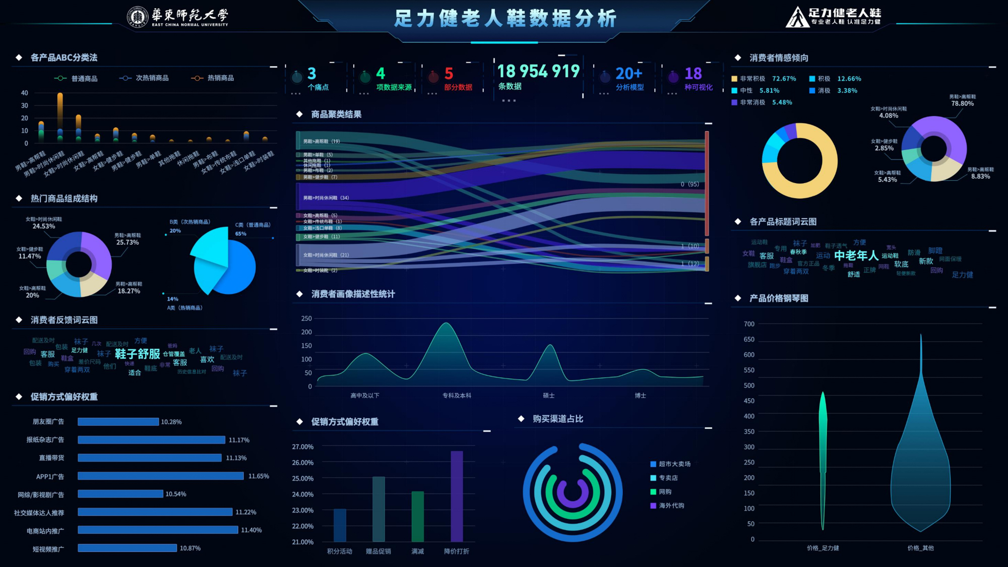 例如,在大赛中获得全国特等奖的项目:“两步并行:银发基本盘X年轻新增量——足力健商务大数据分析”聚焦于“银发经济”背景下老年鞋市场的机遇与挑战,以电商领域的经典模型“人货场理论”为分析框架,运用十五种数据分析方法,从宏观到微观、从描述性分析到预测性分析,全面剖析了足力健品牌在用户、货品、场域三个维度的经营现状及发展瓶颈。