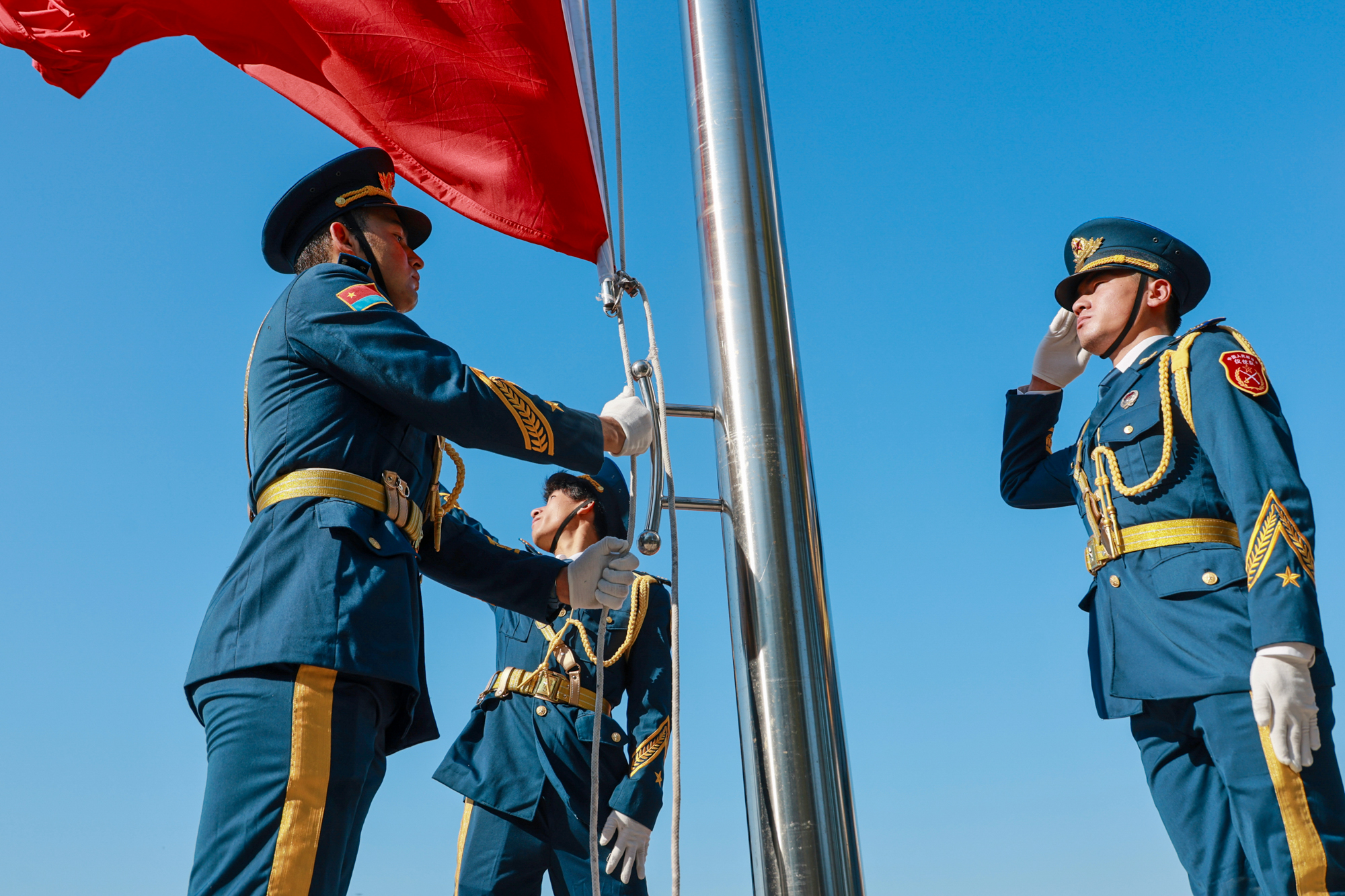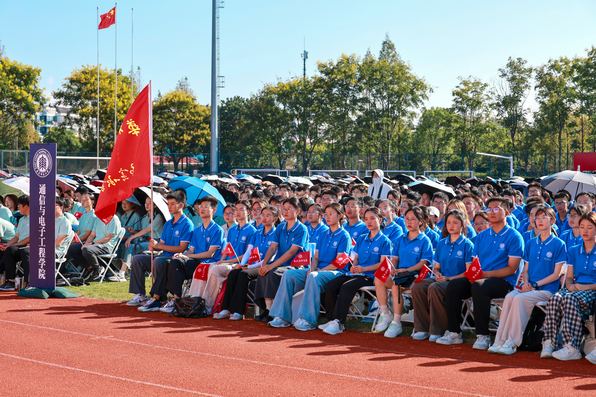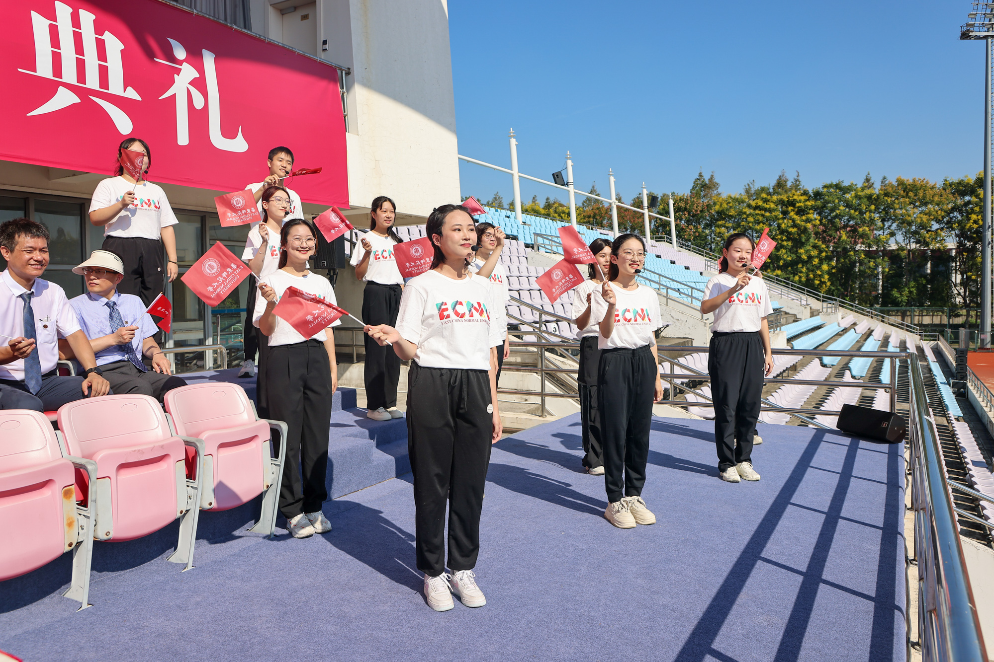 开学典礼在雄壮的国歌声中拉开序幕,全体新生起立向国旗行注目礼,用青春的声音向祖国深情告白,乘着荣光开启新的人生篇章。