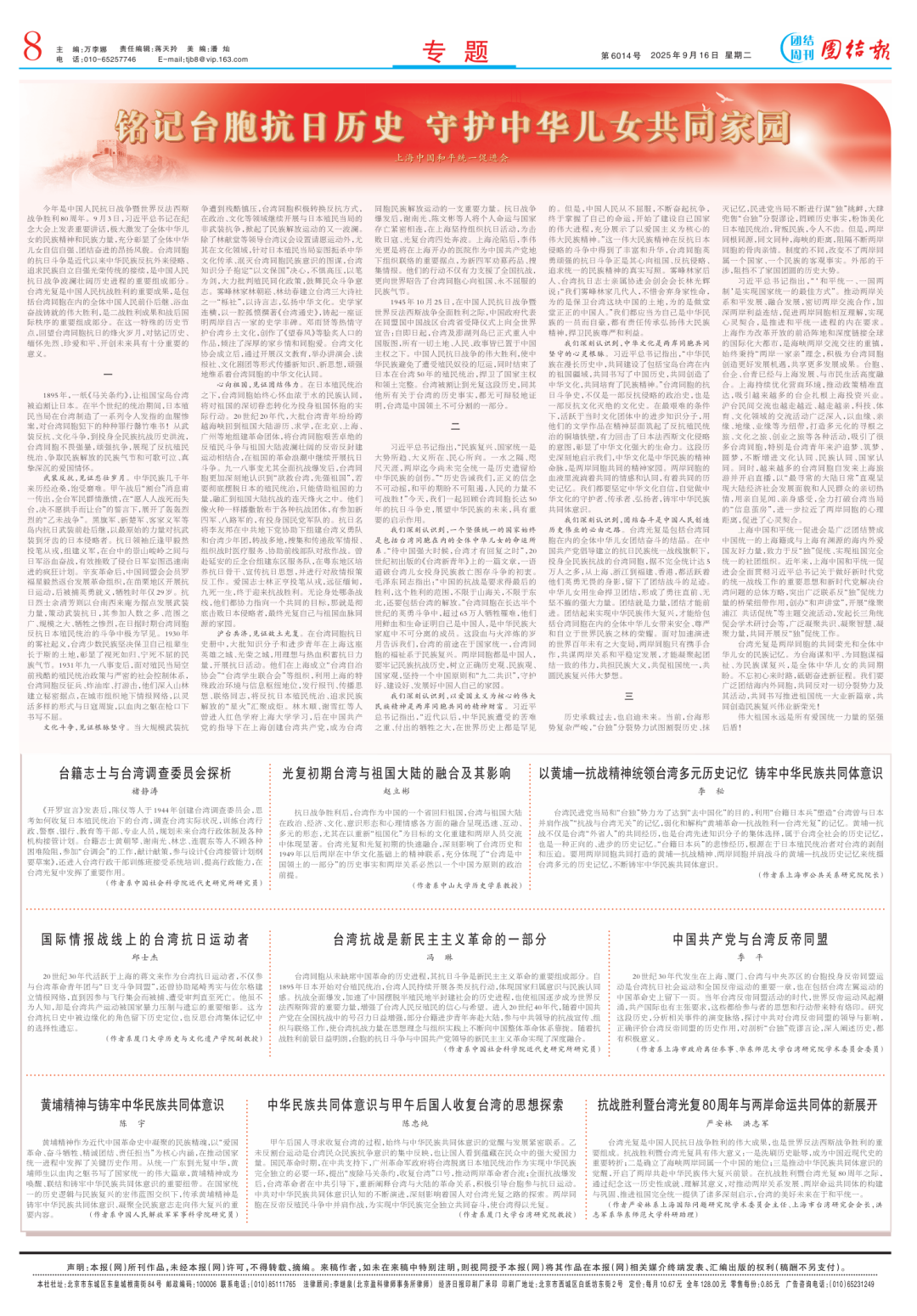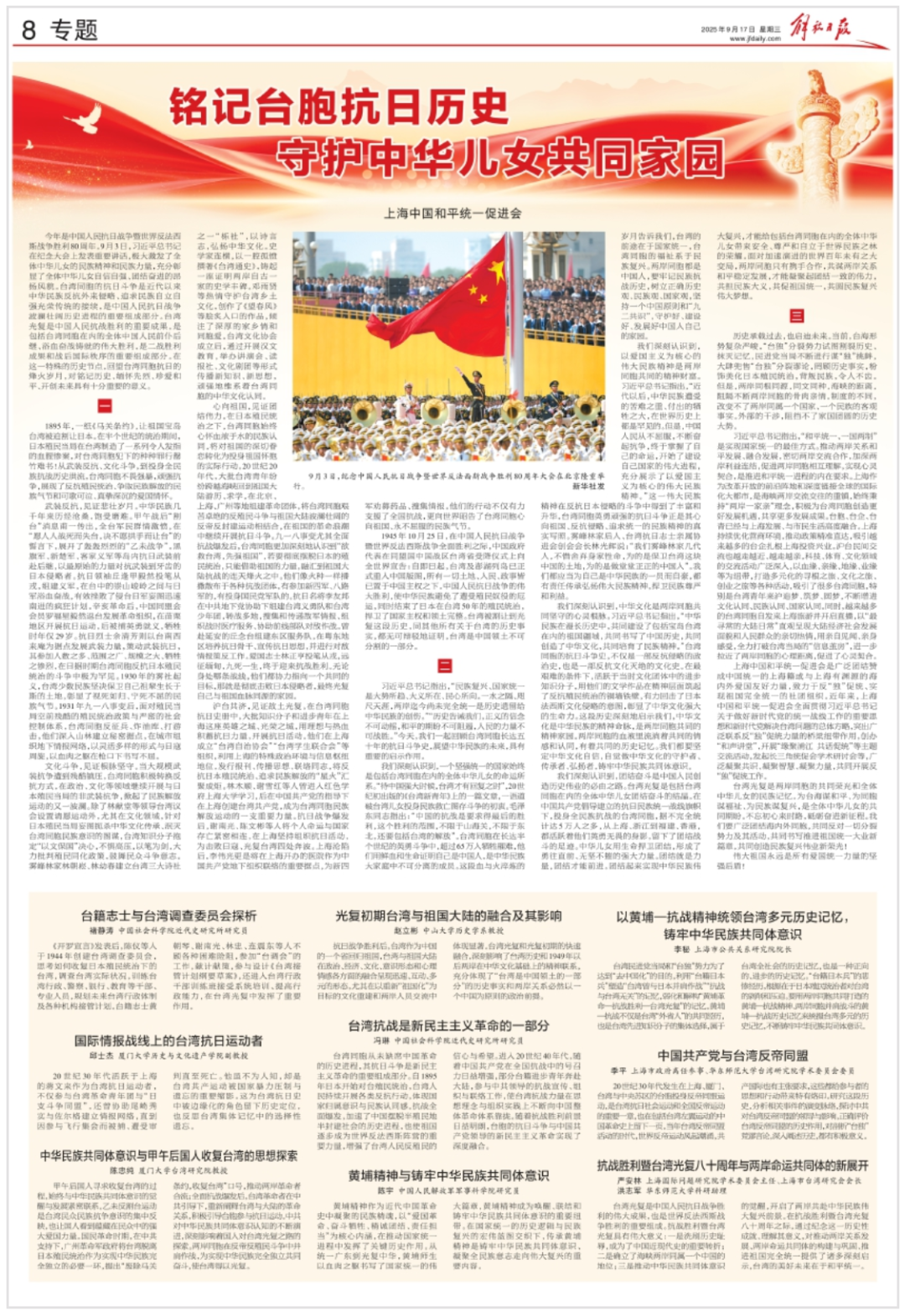 学习贯彻习近平总书记在纪念中国人民抗日战争暨世界反法西斯战争胜利80周年大会上的重要讲话精神,深入研究全民族抗战及台胞抗日历史,阐释中国人民抗日战争胜利和台湾光复的历史意义,9月17日下午,“台胞抗日史国际学术研讨会——纪念中国人民抗日战争胜利暨台湾光复80周年”在上海科学会堂举行。