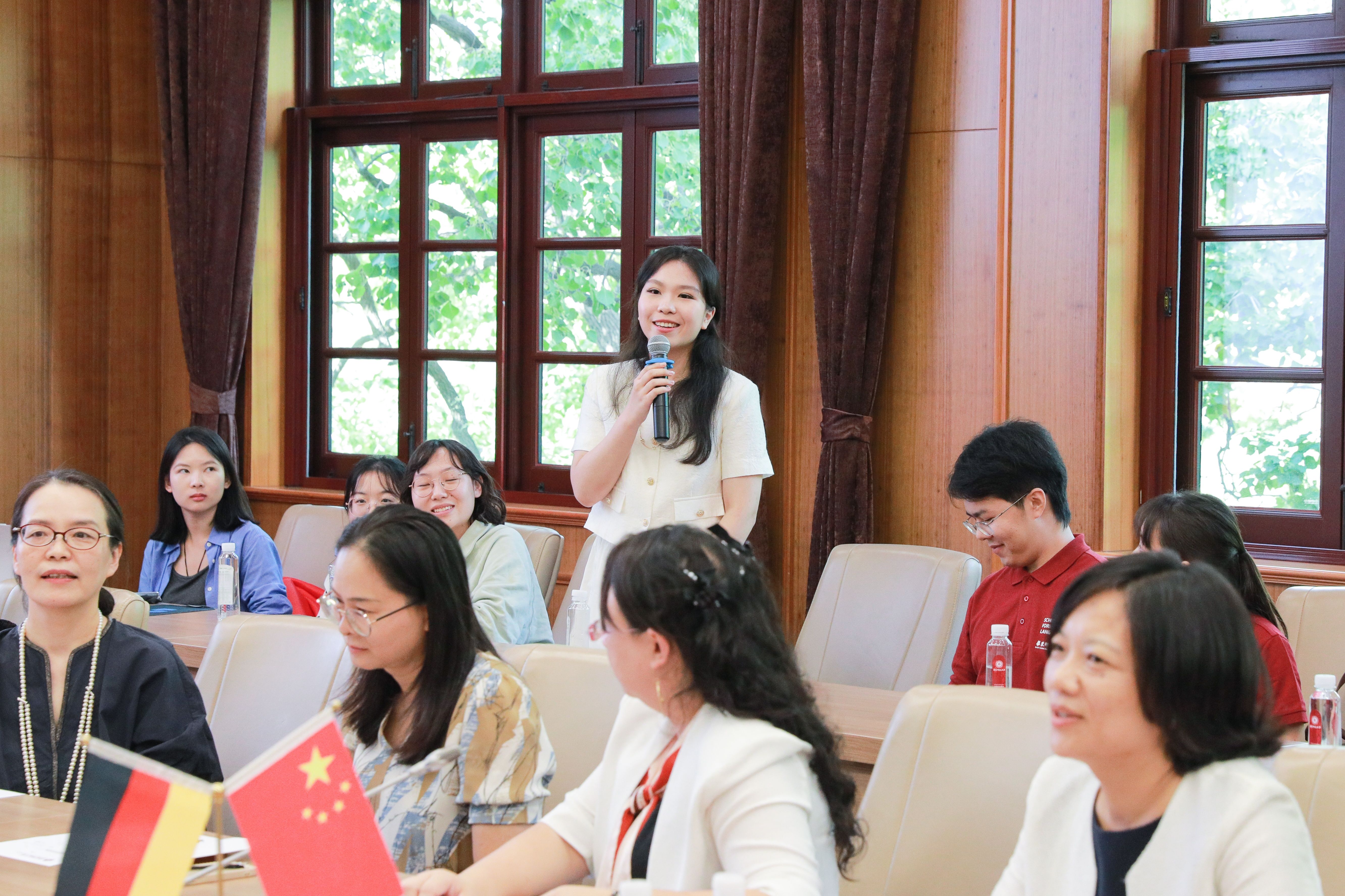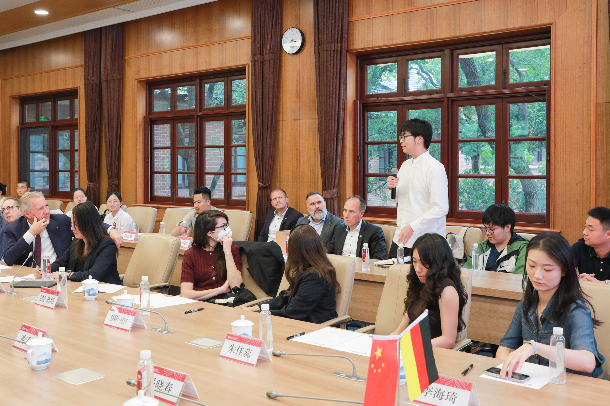 德语系本科生龚若妍今年十月将以交换生身份赴德国柏林洪堡大学学习。她的目标是成为一名优秀的记者,未来在两国人民的跨文化交流合作中发挥桥梁作用。今天,她以“模拟采访”的形式,与武尔夫现场交流了“中国企业如何在德国打造品牌”“两国人民消费文化差异”等话题。