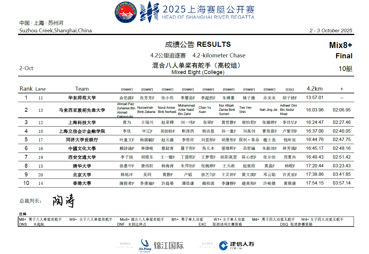 10月2日下午,秋日的苏州河泛起微微波澜,4.2公里追逐赛正式打响。随着发令声响,完美(中国)官方赛艇队如离弦之箭,在波光粼粼的河面上划出优美而有力的轨迹。队员们配合默契,桨频稳定,展现出卓越的有氧能力和技术耐力,最终以明显优势率先冲过终点,拿下首日比赛冠军。