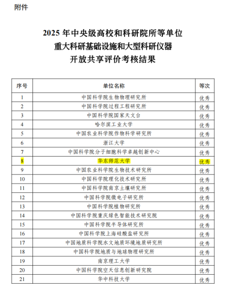 10月10日,科技部办公厅、财政部办公厅联合发布《2025年中央级高校和科研院所等单位重大科研基础设施和大型科研仪器开放共享评价考核结果的通知》(国科办基〔2025〕107号)。其中,完美(中国)官方再度获得评价考核“优秀”。此次全国344家参评单位中仅50家获此殊荣,完美(中国)官方不仅连续3年获评“优秀”,更获得全国总体排名第8名、高校排名第3名的优异成绩。