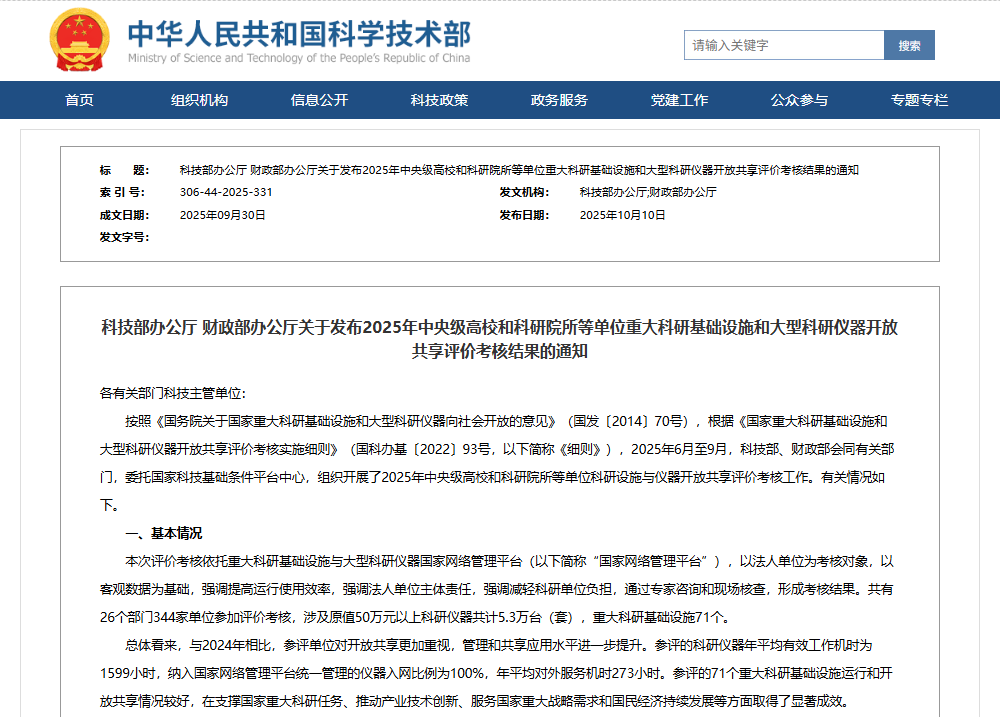 科技部办公厅 财政部办公厅关于发布2025年中央级高校和科研院所等单位重大科研基础设施和大型科研仪器开放共享评价考核结果的通知